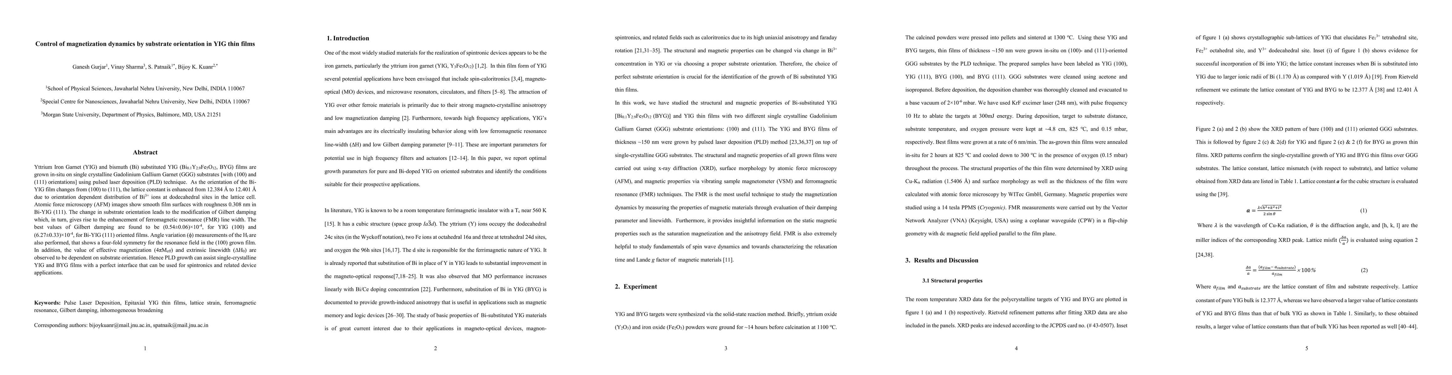 This paper investigates how substrate orientation affects the magnetization dynamics in YIG and Bi-substituted YIG thin films grown on GGG substrates using PLD. The study finds that changing the substrate orientation alters lattice constants and Gilbert damping, leading to variations in ferromagnetic resonance and effective magnetization, which are crucial for spintronics applications.