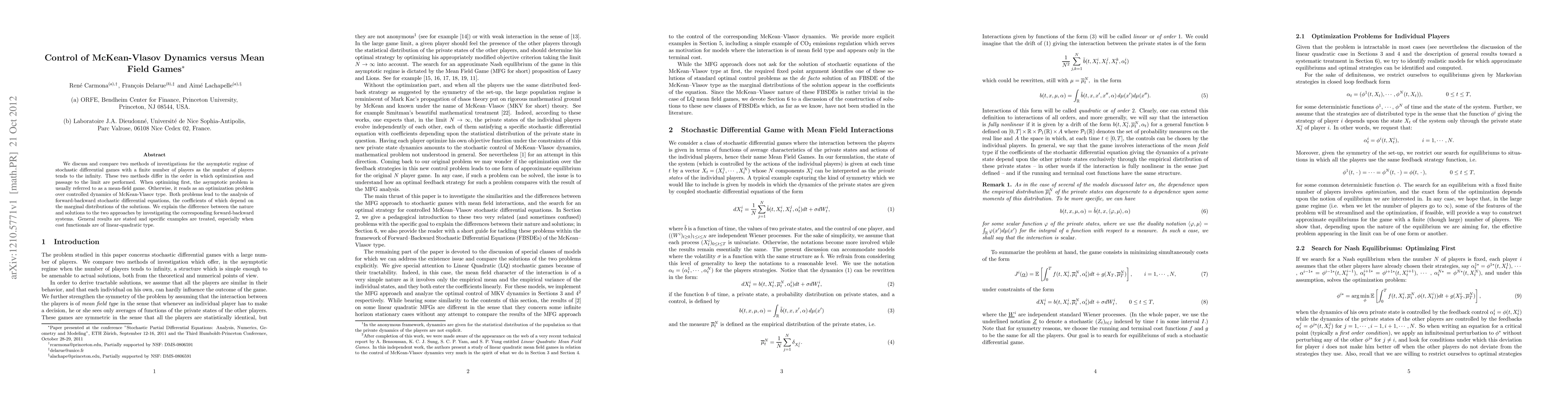 This paper compares two methods for analyzing the asymptotic behavior of stochastic differential games with many players: mean-field games and McKean-Vlasov dynamics. It highlights the differences in optimization and passage to the limit, and explores the solutions of forward-backward stochastic differential equations in both frameworks, particularly for linear-quadratic cost functionals.
