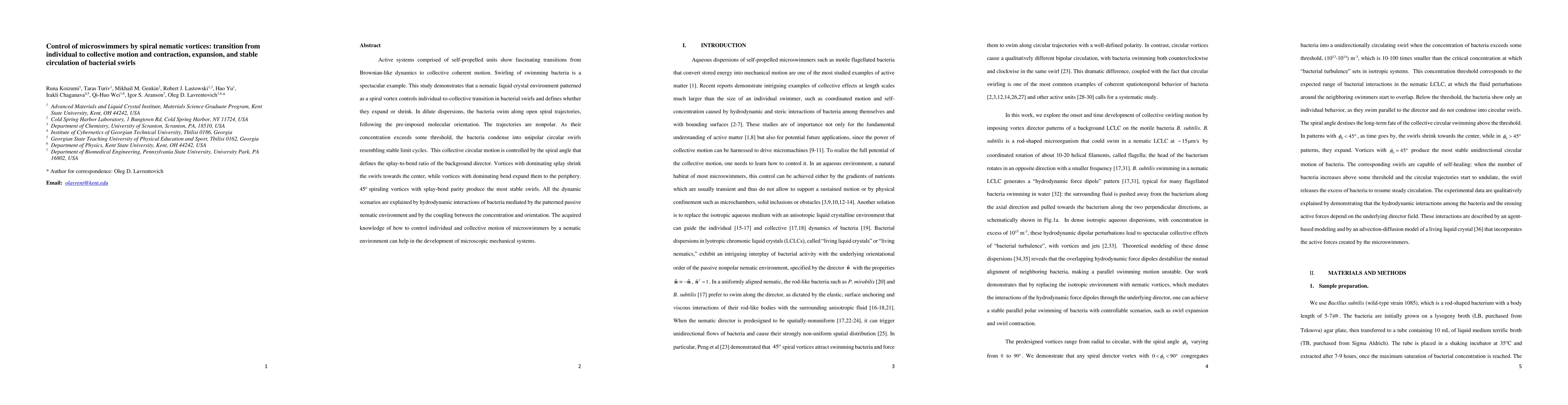 This study investigates how spiral nematic vortices in a liquid crystal environment control the transition from individual to collective motion in bacterial swirls, determining whether they expand or contract. The findings reveal that the spiral angle of the nematic vortex influences the formation of stable, collective circular bacterial swirls, with optimal stability achieved at 45° spirals.