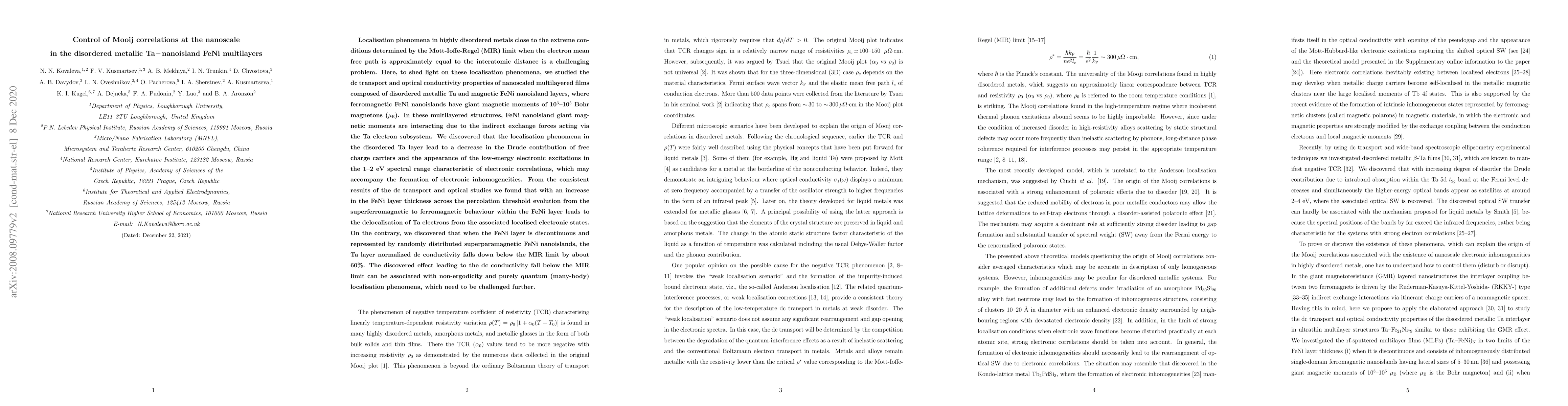 Localisation phenomena in highly disordered metals close to the extreme conditions determined by the Mott-Ioffe-Regel (MIR) limit when the electron mean free path is approximately equal to the interatomic distance is a challenging problem. Here, to shed light on these localisation phenomena, we studied the dc transport and optical conductivity properties of nanoscaled multilayered films composed of disordered metallic Ta and magnetic FeNi nanoisland layers, where ferromagnetic FeNi nanoislands have giant magnetic moments of 10^3-10^5 Bohr magnetons (\mu_B). In these multilayered structures, FeNi nanoisland giant magnetic moments are interacting due to the indirect exchange forces acting via the Ta electron subsystem. We discovered that the localisation phenomena in the disordered Ta layer lead to a decrease in the Drude contribution of free charge carriers and the appearance of the low-energy electronic excitations in the 1-2 eV spectral range characteristic of electronic correlations, which may accompany the formation of electronic inhomogeneities. From the consistent results of the dc transport and optical studies we found that with an increase in the FeNi layer thickness across the percolation threshold evolution from the superferromagnetic to ferromagnetic behaviour within the FeNi layer leads to the delocalisation of Ta electrons from the associated localised electronic states. On the contrary, we discovered that when the FeNi layer is discontinuous and represented by randomly distributed superparamagnetic FeNi nanoislands, the Ta layer normalized dc conductivity falls down below the MIR limit by about 60%. The discovered effect leading to the dc conductivity fall below the MIR limit can be associated with non-ergodicity and purely quantum (many-body) localisation phenomena, which need to be challenged further.