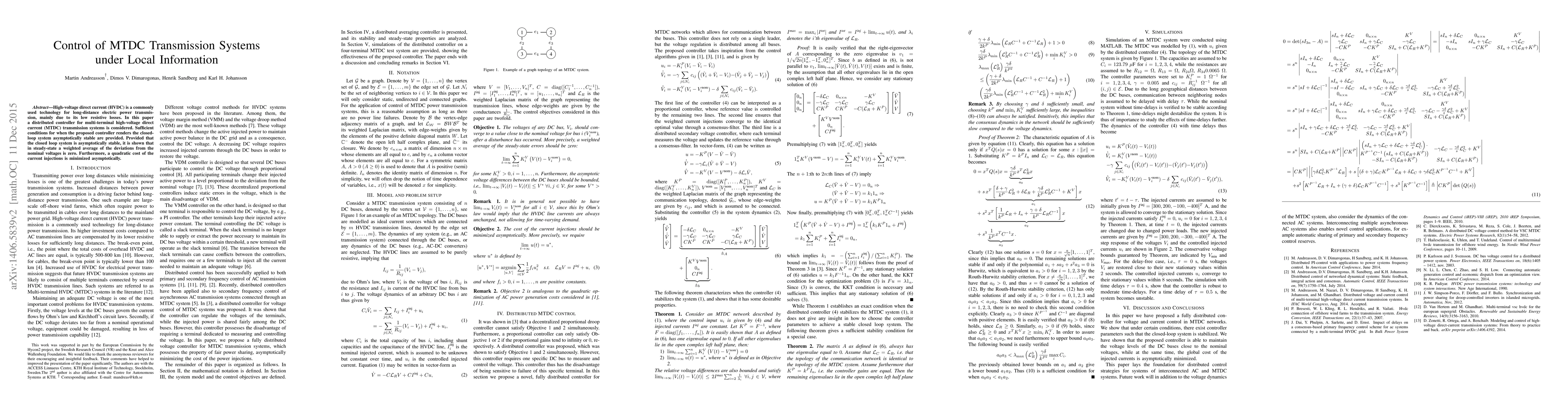 This paper proposes a distributed controller for multi-terminal high-voltage direct current (MTDC) transmission systems, ensuring asymptotic stability and zero steady-state deviation from nominal voltages. The controller also minimizes the quadratic cost of current injections.