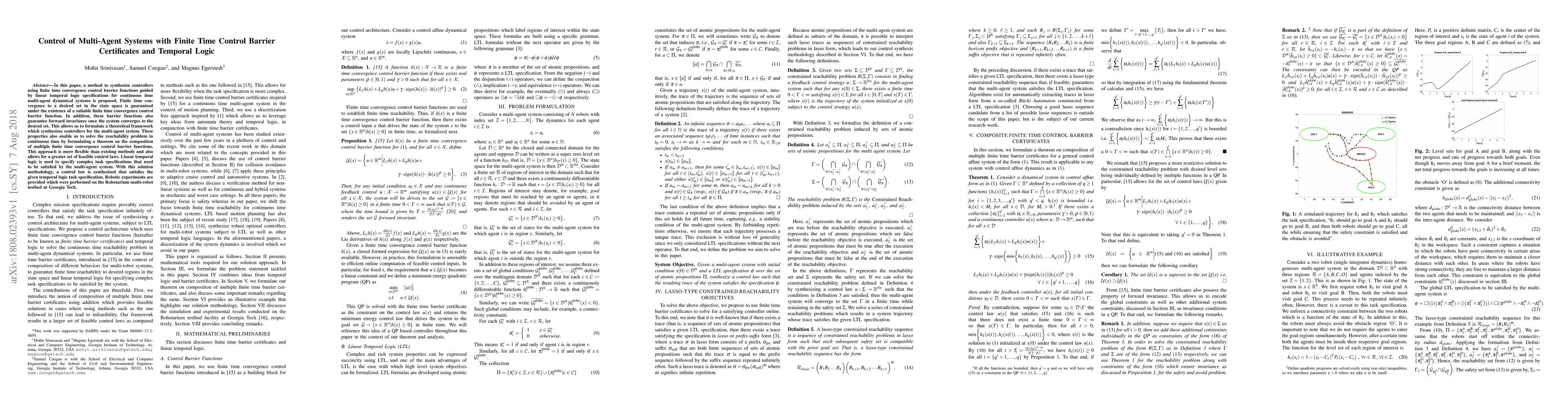 This paper proposes a novel method to synthesize controllers for multi-agent systems using finite time convergence control barrier functions, guided by linear temporal logic specifications, ensuring convergence to desired states and forward invariance. The approach provides flexibility in control laws and was validated through robotic experiments on the Robotarium multi-robot testbed.