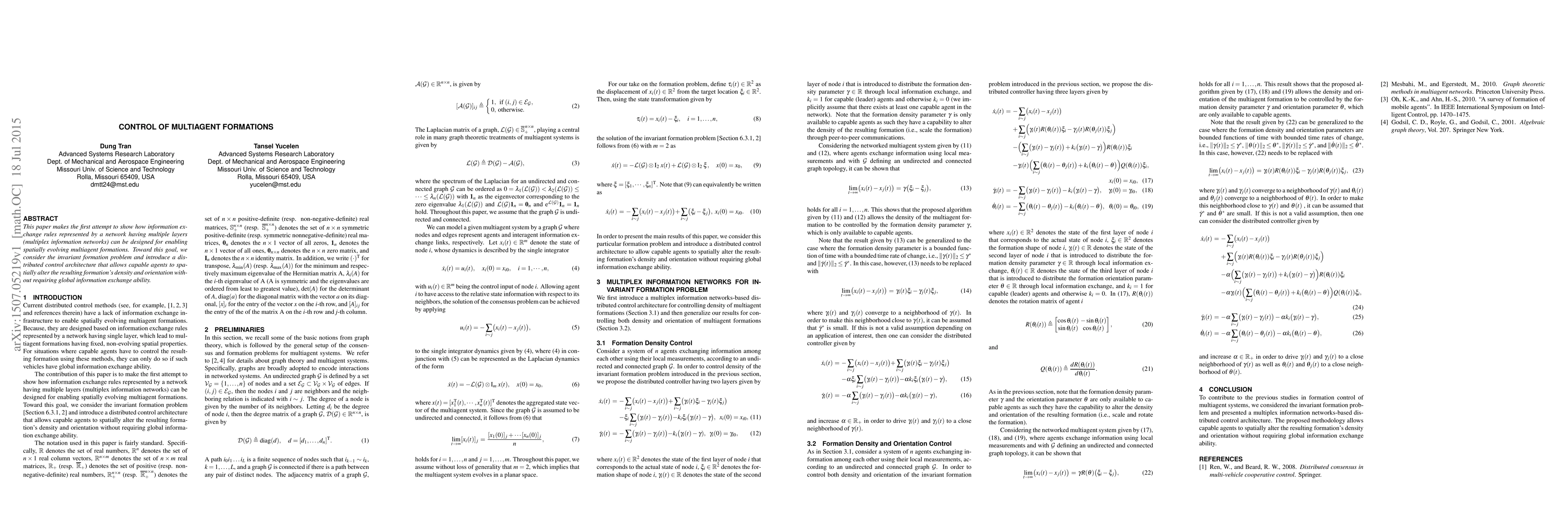 This paper proposes a distributed control architecture for multiagent formations using multiplex information networks, enabling agents to adjust formation density and orientation without global information. The approach focuses on the invariant formation problem and leverages local information exchange.