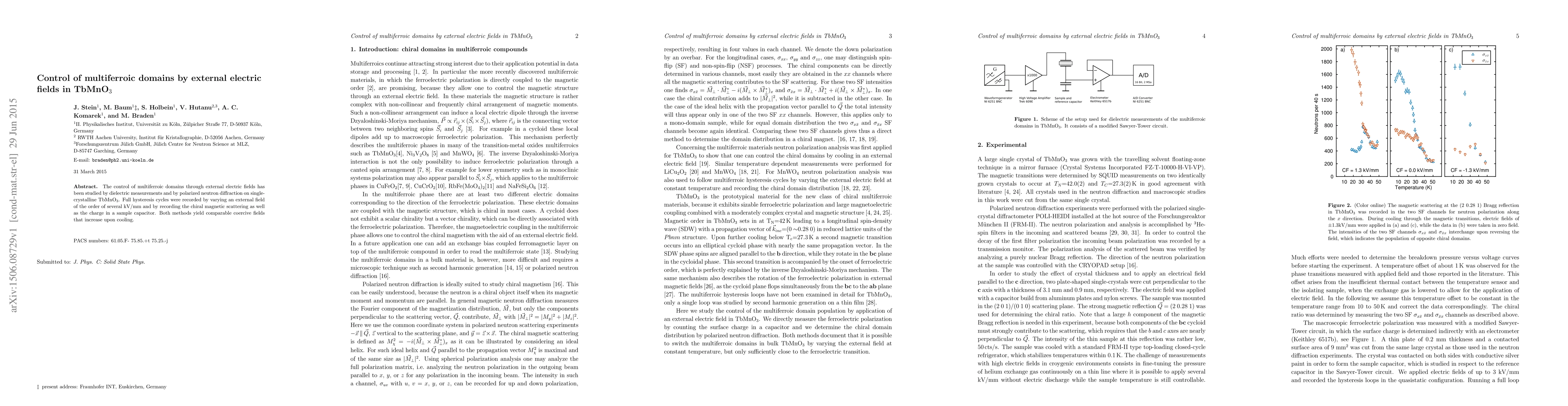 This study investigates the manipulation of multiferroic domains in TbMnO$_3$ using external electric fields, employing dielectric and polarized neutron diffraction techniques. Results show comparable coercive fields that rise with decreasing temperature.