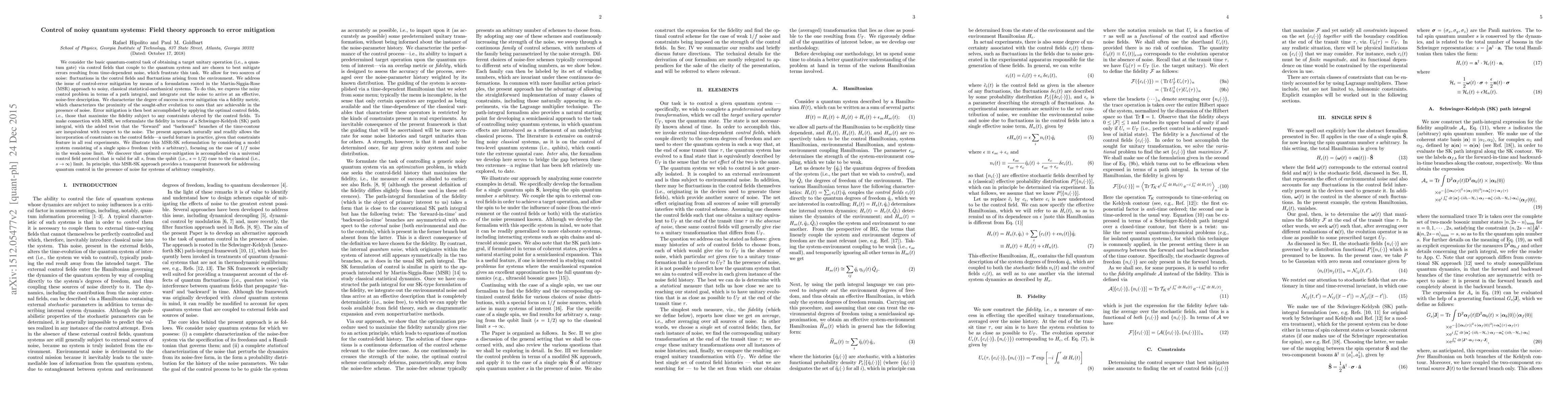 This paper proposes a field theory approach using the Martin-Siggia-Rose (MSR) and Schwinger-Keldysh (SK) frameworks to mitigate errors in noisy quantum systems. It formulates the control problem as a path integral, optimizing control fields to maximize fidelity despite noise, and demonstrates a universal control protocol for a single spin system under $1/f$ noise.