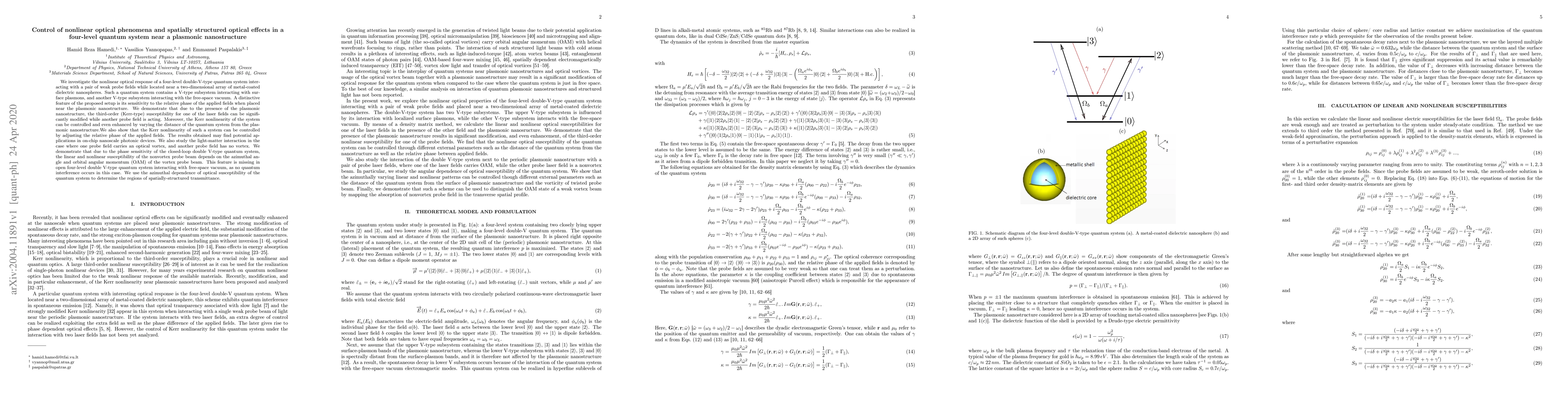 We investigate the nonlinear optical response of a four-level double-V-type quantum system interacting with a pair of weak probe fields while located near a two-dimensional array of metal-coated dielectric nanospheres. Such a quantum system contains a V-type subsystem interacting with surface plasmons, and another V-type subsystem interacting with the free-space vacuum. A distinctive feature of the proposed setup is its sensitivity to the relative phase of the applied fields when placed near the plasmonic nanostructure. We demonstrate that due to the presence of the plasmonic nanostructure, the third-order (Kerr-type) susceptibility for one of the laser fields can be significantly modified while another probe field is acting. Moreover, the Kerr nonlinearity of the system can be controlled and even enhanced by varying the distance of the quantum system from the plasmonic nanostructure.We also show that the Kerr nonlinearity of such a system can be controlled by adjusting the relative phase of the applied fields. The results obtained may find potential applications in on-chip nanoscale photonic devices. We also study the light-matter interaction in the case where one probe field carries an optical vortex, and another probe field has no vortex. We demonstrate that due to the phase sensitivity of the closed-loop double V-type quantum system, the linear and nonlinear susceptibility of the nonvortex probe beam depends on the azimuthal angle and orbital angular momentum (OAM) of the vortex probe beam. This feature is missing in open four-level double V-type quantum system interacting with free-space vacuum, as no quantum interference occurs in this case. We use the azimuthal dependence of optical susceptibility of the quantum system to determine the regions of spatially-structured transmittance.