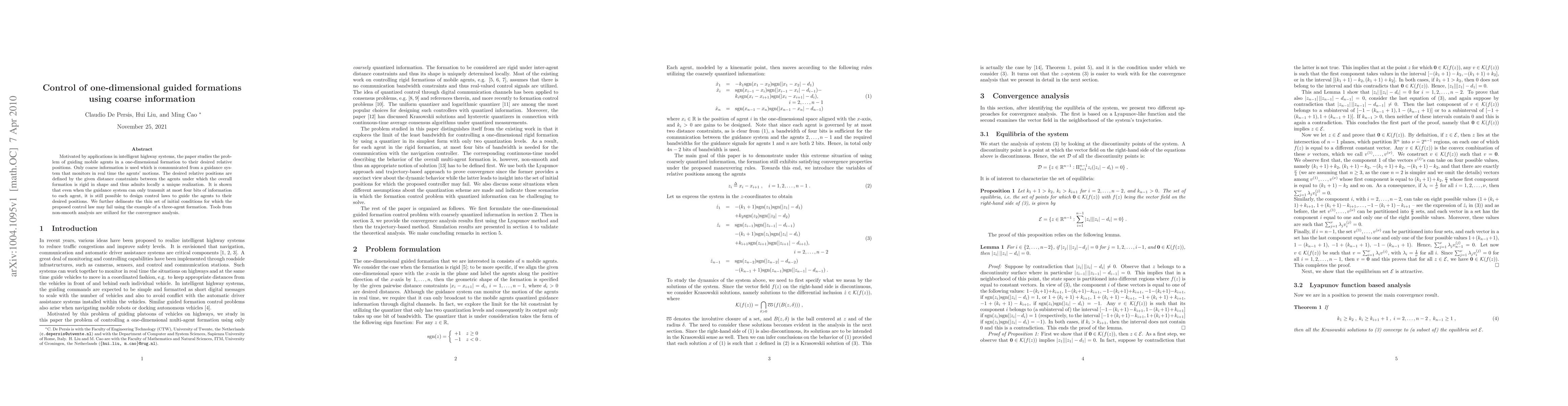 Motivated by applications in intelligent highway systems, the paper studies the problem of guiding mobile agents in a one-dimensional formation to their desired relative positions. Only coarse information is used which is communicated from a guidance system that monitors in real time the agents' motions. The desired relative positions are defined by the given distance constraints between the agents under which the overall formation is rigid in shape and thus admits locally a unique realization. It is shown that even when the guidance system can only transmit at most four bits of information to each agent, it is still possible to design control laws to guide the agents to their desired positions. We further delineate the thin set of initial conditions for which the proposed control law may fail using the example of a three-agent formation. Tools from non-smooth analysis are utilized for the convergence analysis.