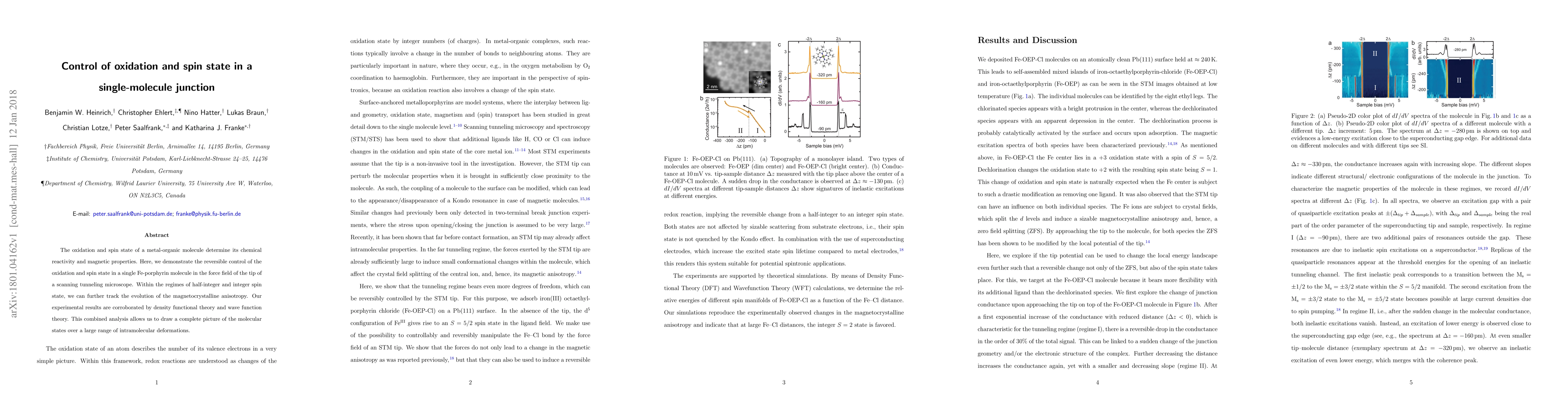 This research demonstrates reversible control over the oxidation and spin state of a single Fe-porphyrin molecule using a scanning tunneling microscope, revealing the evolution of magnetocrystalline anisotropy, supported by density functional theory and wave function theory. The study provides a comprehensive understanding of molecular states under various deformations.