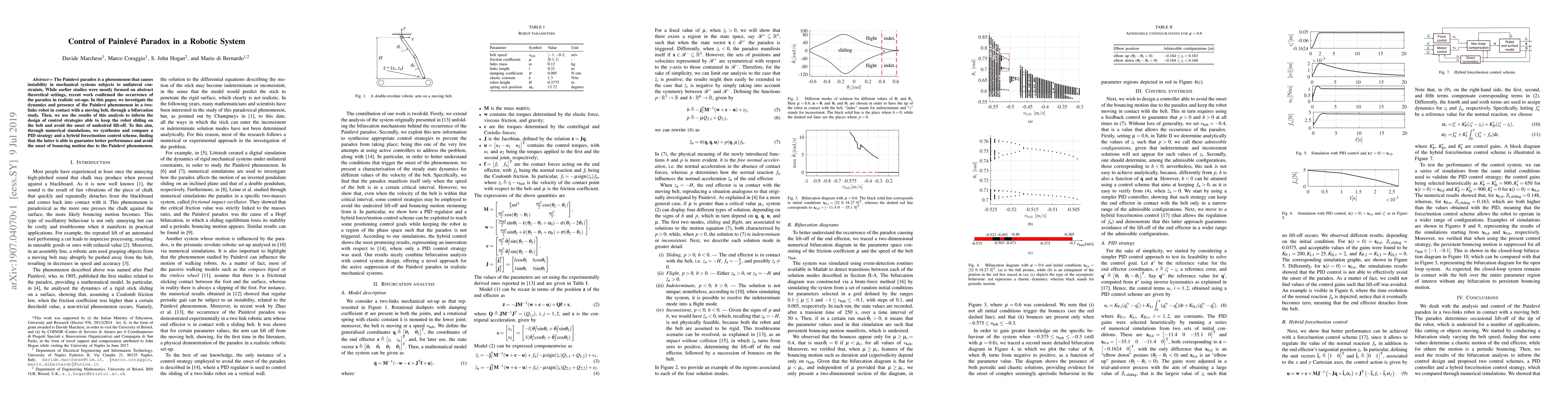 This paper investigates the Painlevé paradox in a two-link robotic system in contact with a moving belt, employing a bifurcation study to understand its dynamics. It then designs control strategies, including a PID and a hybrid force/motion scheme, finding that the hybrid approach better prevents instability and lift-off.