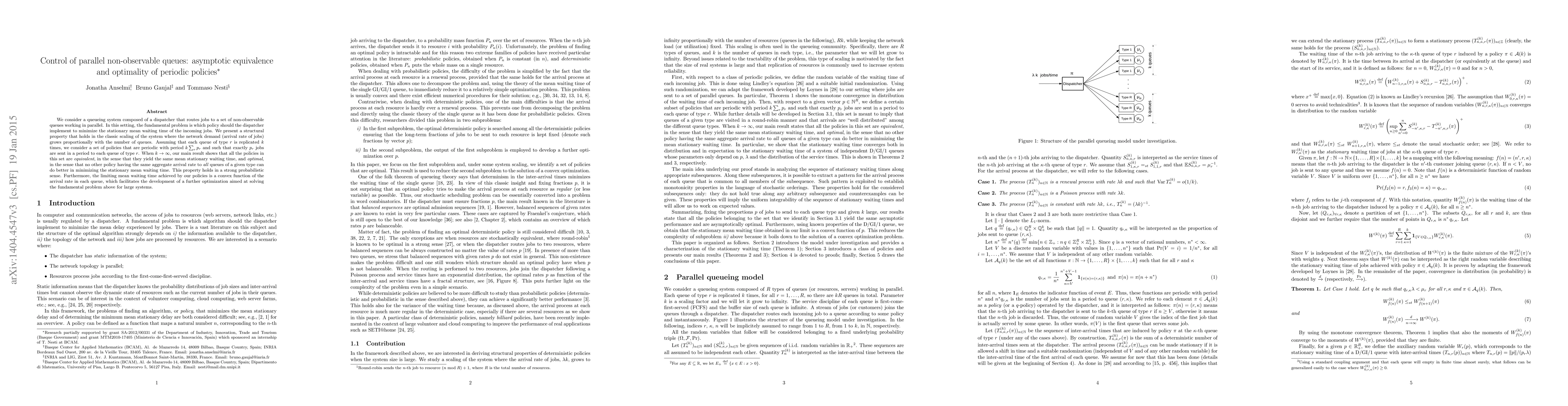 We consider a queueing system composed of a dispatcher that routes deterministically jobs to a set of non-observable queues working in parallel. In this setting, the fundamental problem is which policy should the dispatcher implement to minimize the stationary mean waiting time of the incoming jobs. We present a structural property that holds in the classic scaling of the system where the network demand (arrival rate of jobs) grows proportionally with the number of queues. Assuming that each queue of type $r$ is replicated $k$ times, we consider a set of policies that are periodic with period $k \sum_r p_r$ and such that exactly $p_r$ jobs are sent in a period to each queue of type $r$. When $k\to\infty$, our main result shows that all the policies in this set are equivalent, in the sense that they yield the same mean stationary waiting time, and optimal, in the sense that no other policy having the same aggregate arrival rate to \emph{all} queues of a given type can do better in minimizing the stationary mean waiting time. This property holds in a strong probabilistic sense. Furthermore, the limiting mean waiting time achieved by our policies is a convex function of the arrival rate in each queue, which facilitates the development of a further optimization aimed at solving the fundamental problem above for large systems.