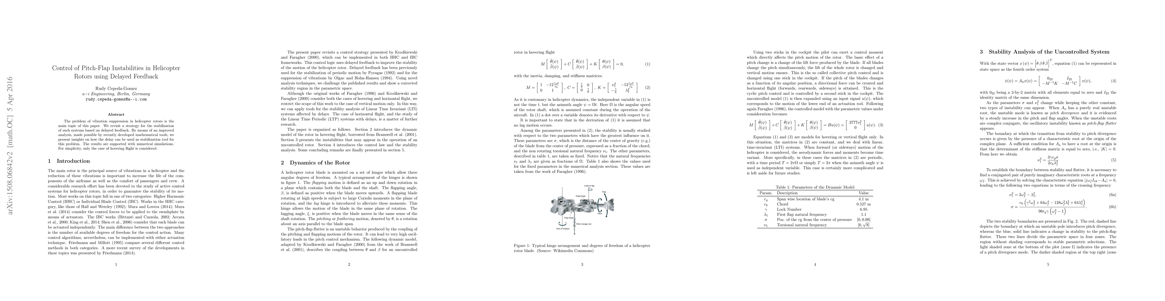 A study explores using delayed feedback to control pitch-flap instabilities in helicopter rotors, achieving improved vibration suppression through numerical simulations.