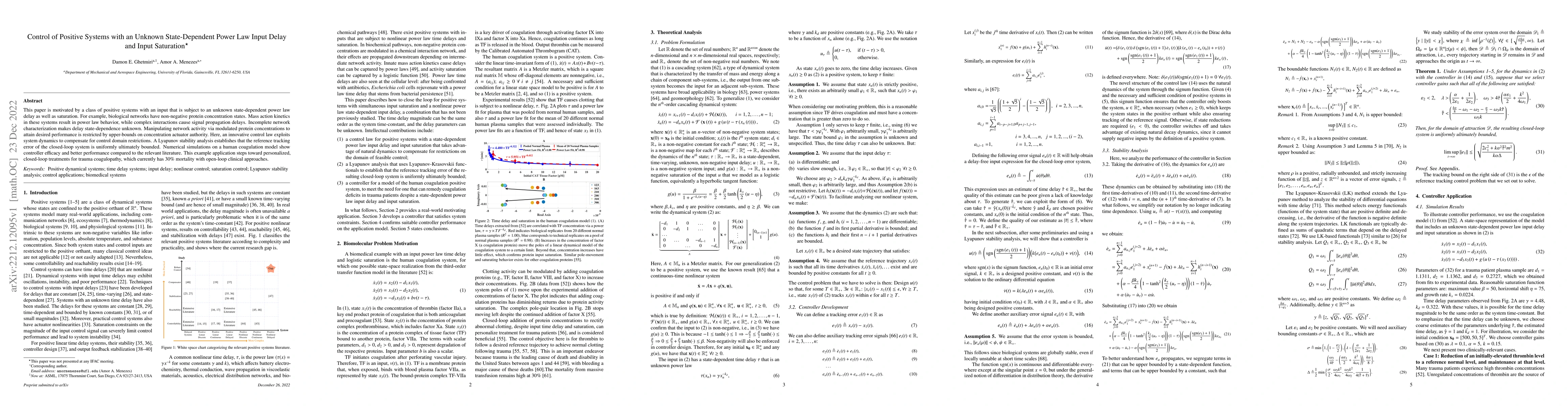 This paper is motivated by a class of positive systems with an input that is subject to an unknown state-dependent power law delay as well as saturation. For example, biological networks have non-negative protein concentration states. Mass action kinetics in these systems result in power law behavior, while complex interactions cause signal propagation delays. Incomplete network characterization makes delay state-dependence unknown. Manipulating network activity via modulated protein concentrations to attain desired performance is restricted by upper-bounds on concentration actuator authority. Here, an innovative control law exploits system dynamics to compensate for control domain restrictions. A Lyapunov stability analysis establishes that the reference tracking error of the closed-loop system is uniformly ultimately bounded. Numerical simulations on a human coagulation model show controller efficacy and better performance compared to the relevant literature. This example application steps toward personalized, closed-loop treatments for trauma coagulopathy, which currently has 30% mortality with open-loop clinical approaches.