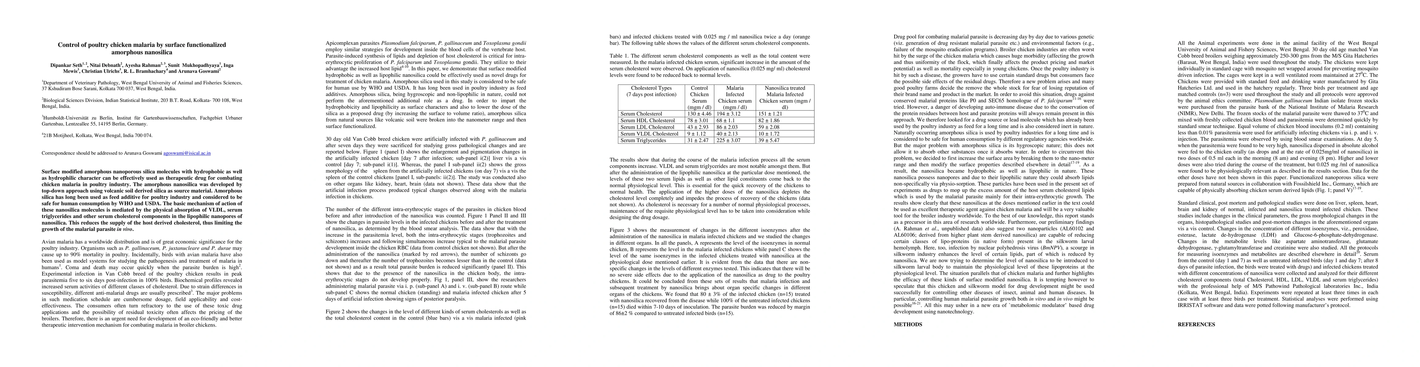 Surface modified amorphous nanoporous silica molecules with hydrophobic as well as hydrophilic character can be effectively used as therapeutic drug for combating chicken malaria in poultry industry. The amorphous nanosilica was developed by top-down approach using volcanic soil derived silica as source material. Amorphous silica has long been used as feed additive for poultry industry and considered to be safe for human consumption by WHO and USDA. The basic mechanism of action of these nanosilica molecules is mediated by the physical absorption of VLDL, serum triglycerides and other serum cholesterol components in the lipophilic nanopores of nanosilica. This reduces the supply of the host derived cholesterol, thus limiting the growth of the malarial parasite in vivo.