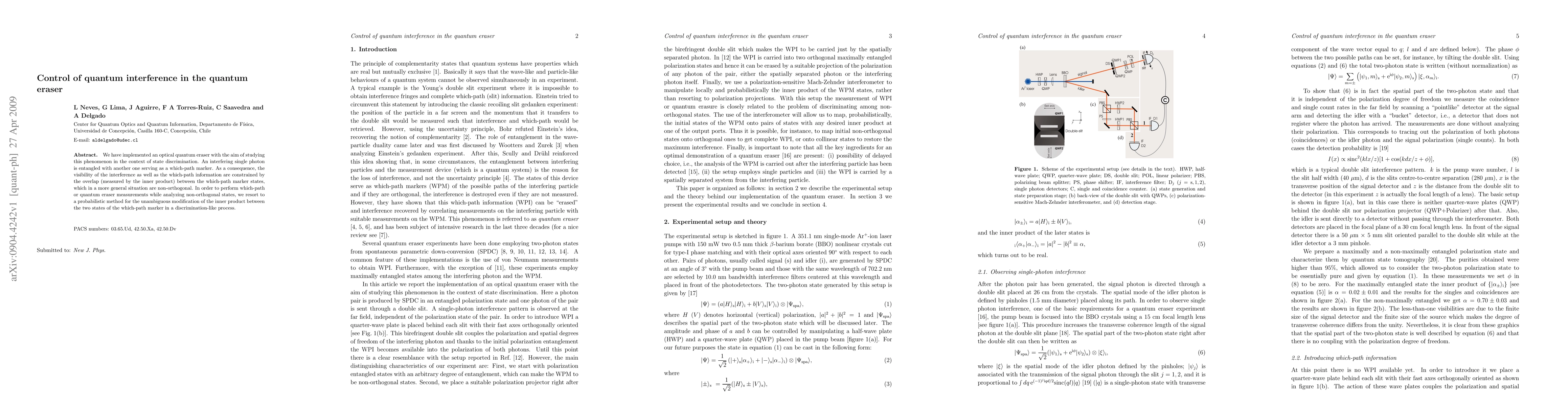 This paper explores an optical quantum eraser experiment to study quantum interference and state discrimination, focusing on entangled photons where one serves as a which-path marker. The authors develop a probabilistic method to manipulate the inner product between non-orthogonal which-path marker states to control interference visibility and which-path information.