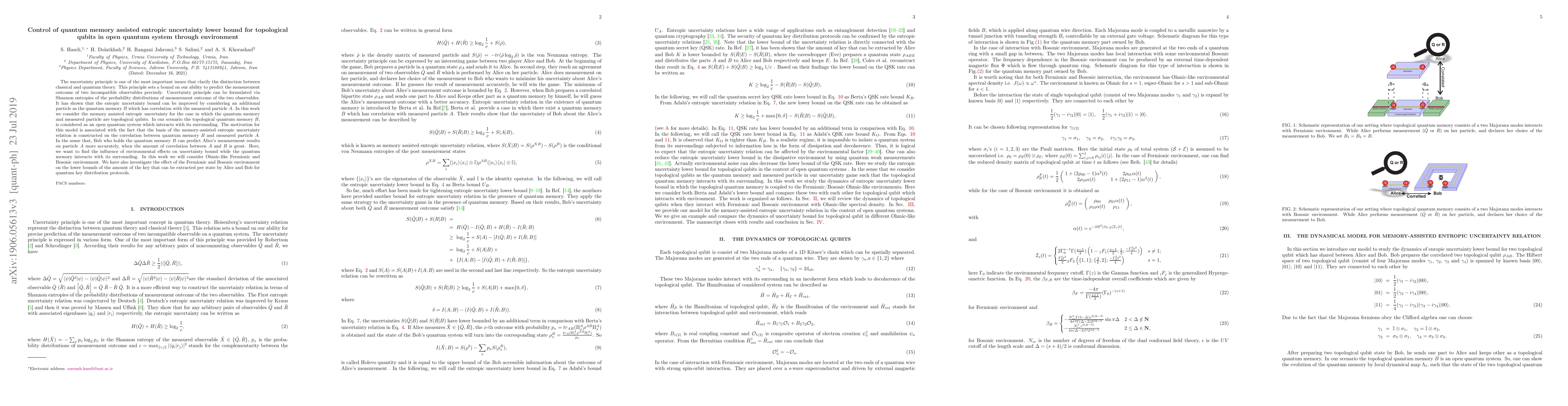 This paper investigates how quantum memory assisted entropic uncertainty bounds for topological qubits can be controlled in open quantum systems, particularly focusing on the influence of environmental interactions. It explores the impact of Ohmic-like Fermionic and Bosonic environments on the uncertainty principle and the extraction of keys in quantum key distribution protocols.