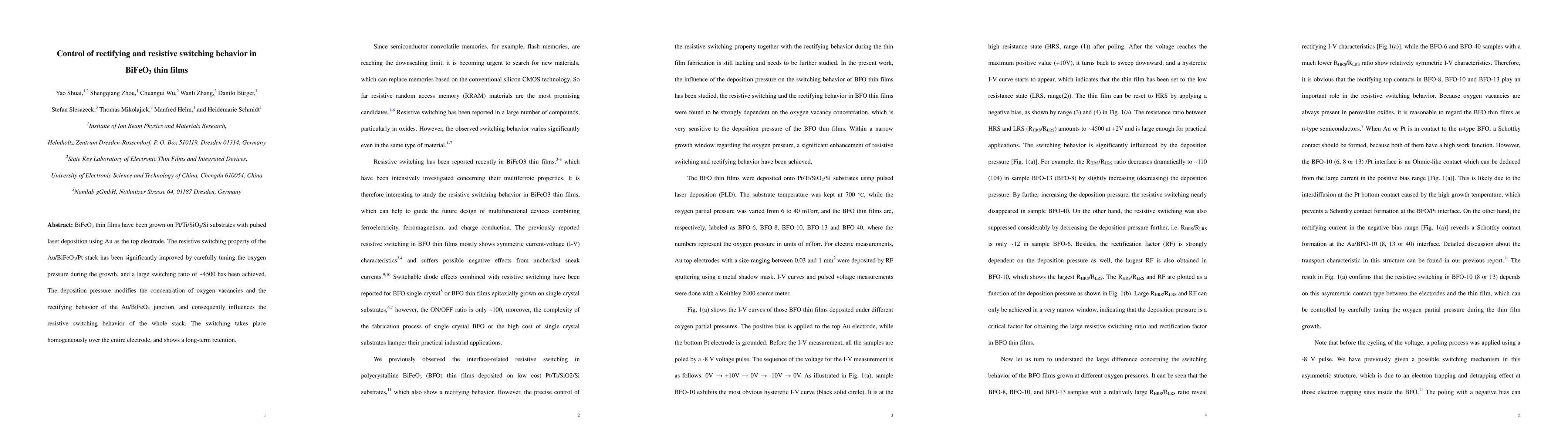 Summary: BiFeO3 thin films grown via pulsed laser deposition with controlled oxygen pressure enhance resistive switching properties in Au/BiFeO3/Pt stacks, achieving a large switching ratio of ~4500 and homogeneous switching behavior with long-term retention. The deposition pressure impacts oxygen vacancy concentration and junction rectifying behavior.