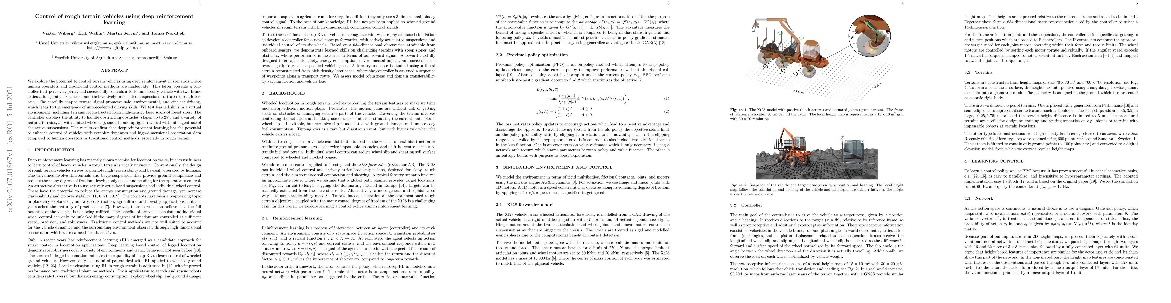 The research employs deep reinforcement learning (DRL) to control rough terrain vehicles, utilizing a carefully shaped reward signal that encourages safe, efficient, and environmentally friendly driving. The controller perceives, plans, and controls a 16-tonne forestry vehicle with complex dynamics and high-dimensional observation data, using a local heightmap for obstacle perception and coupling it with proprioceptive features for efficient traversal.