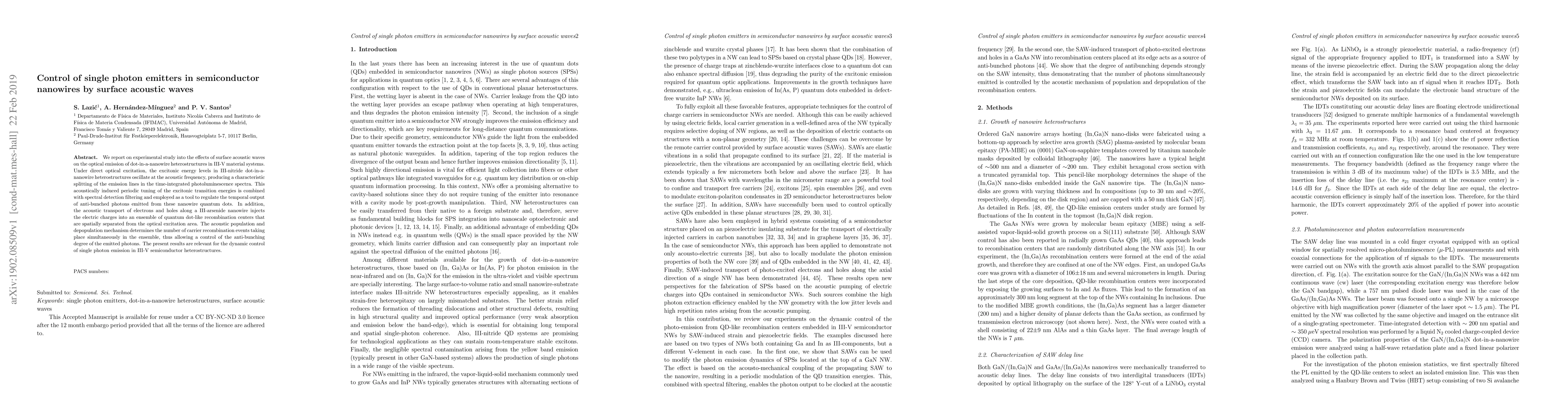 We report on experimental study into the effects of surface acoustic waves on the optical emission of dot-in-a-nanowire heterostructures in III-V material systems. Under direct optical excitation, the excitonic energy levels in III-nitride dot-in-a-nanowire heterostructures oscillate at the acoustic frequency, producing a characteristic splitting of the emission lines in the time-integrated photoluminescence spectra. This acoustically induced periodic tuning of the excitonic transition energies is combined with spectral detection filtering and employed as a tool to regulate the temporal output of anti-bunched photons emitted from these nanowire quantum dots. In addition, the acoustic transport of electrons and holes along a III-arsenide nanowire injects the electric charges into an ensemble of quantum dot-like recombination centers that are spatially separated from the optical excitation area. The acoustic population and depopulation mechanism determines the number of carrier recombination events taking place simultaneously in the ensemble, thus allowing a control of the anti-bunching degree of the emitted photons. The present results are relevant for the dynamic control of single photon emission in III-V semiconductor heterostructures.