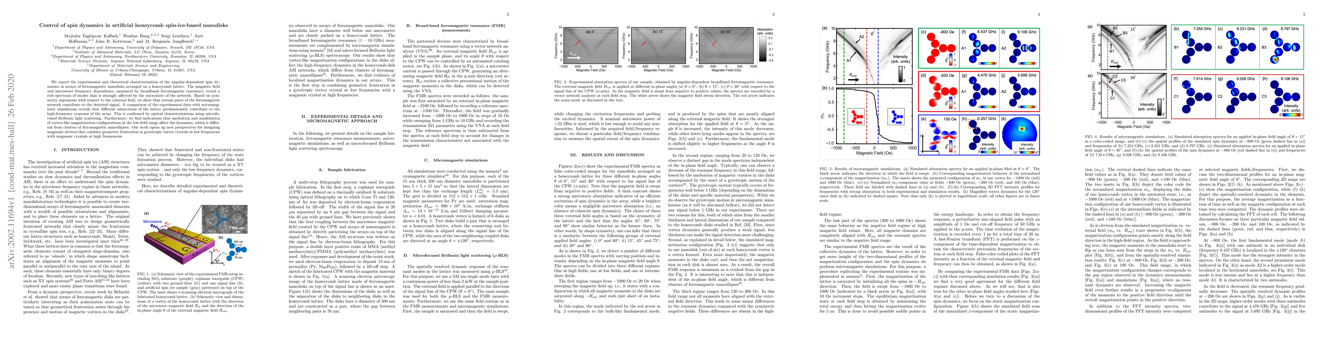 We report the experimental and theoretical characterization of the angular-dependent spin dynamics in arrays of ferromagnetic nanodisks arranged on a honeycomb lattice. The magnetic field and microwave frequency dependence, measured by broadband ferromagnetic resonance, reveal a rich spectrum of modes that is strongly affected by the microstate of the network. Based on symmetry arguments with respect to the external field, we show that certain parts of the ferromagnetic network contribute to the detected signal. A comparison of the experimental data with micromagnetic simulations reveals that different subsections of the lattice predominantly contribute to the high-frequency response of the array. This is confirmed by optical characterizations using microfocused Brillouin light scattering. Furthermore, we find indications that nucleation and annihilation of vortex-like magnetization configurations in the low-field range affect the dynamics, which is different from clusters of ferromagnetic nanoellipses. Our work opens up new perspectives for designing magnonic devices that combine geometric frustration in gyrotropic vortex crystals at low frequencies with magnonic crystals at high frequencies.