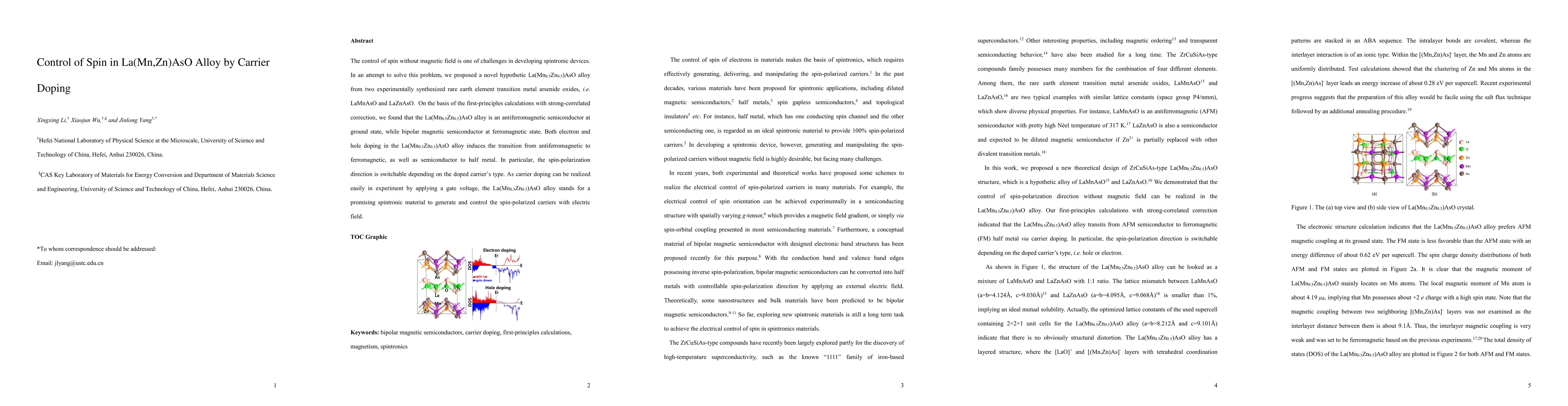 The control of spin without magnetic field is one of challenges in developing spintronic devices. In an attempt to solve this problem, we proposed a novel hypothetic LaMn0.5Zn0.5AsO alloy from two experimentally synthesized rare earth element transition metal arsenide oxides, i.e. LaMnAsO and LaZnAsO. On the basis of the first-principles calculations with strong-correlated correction, we found that the LaMn0.5Zn0.5AsO alloy is an antiferromagnetic semiconductor at ground state, while bipolar magnetic semiconductor at ferromagnetic state. Both electron and hole doping in the LaMn0.5Zn0.5AsO alloy induces the transition from antiferromagnetic to ferromagnetic, as well as semiconductor to half metal. In particular, the spin-polarization direction is switchable depending on the doped carrier's type. As carrier doping can be realized easily in experiment by applying a gate voltage, the LaMn0.5Zn0.5AsO alloy stands for a promising spintronic material to generate and control the spin-polarized carriers with electric field.