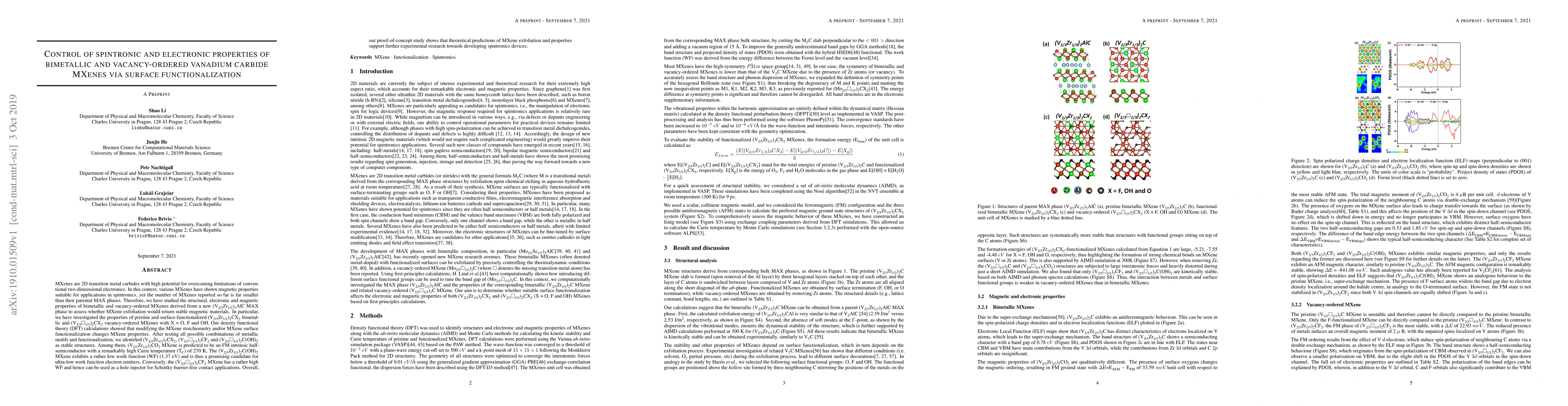 MXenes are 2D transition metal carbides with high potential for overcoming limitations of conventional two-dimensional electronics. In this context, various MXenes have shown magnetic properties suitable for applications in spintronics, yet the number of MXenes reported so far is far smaller than their parental MAX phases. Therefore, we have studied the structural, electronic and magnetic properties of bimetallic and vacancy-ordered MXenes derived from a new $(V_{2/3}Zr_{1/3})_2AlC $ MAX phase to assess whether MXene exfoliation would return stable magnetic materials. In particular, we have investigated the properties of pristine and surface-functionalized $(V_{2/3}Zr_{1/3})_2CX_2$ bimetallic and $(V_{2/3} \square_{1/3})_2CX2$ vacancy-ordered MXenes with X = O, F and OH. Our density functional theory (DFT) calculations showed that modifying the MXene stoichiometry and/or MXene surface functionalization changes MXene properties. After testing all possible combinations of metallic motifs and functionalization, we identified $V_{2/3}Zr_{1/3})_2CX_2$, $(V_{2/3}\square_{1/3})_2CF_2$ and $(V_{2/3}\square_{1/3})_2C(OH)_2$ as stable structures. Among them, $(V_{2/3}Zr_{1/3})_2CO_2$ MXene is predicted to be an FM intrinsic half-semiconductor with a remarkably high Curie temperature ($T_C$)) of 270 K. The $(V_{2/3}Zr_{1/3})_2C(OH)_2$ MXene exhibits a rather low work function (WF) (1.37 eV) and is thus a promising candidate for ultra-low work function electron emitters. Conversely, the $(V_{2/3}\square_{1/3})_2CF_2$ MXene has a rather high WF and hence can be used as a hole injector for Schottky-barrier-free contact applications. Overall, our proof-of-concept study shows that theoretical predictions of MXene exfoliation and properties support further experimental research towards developing spintronics devices.
