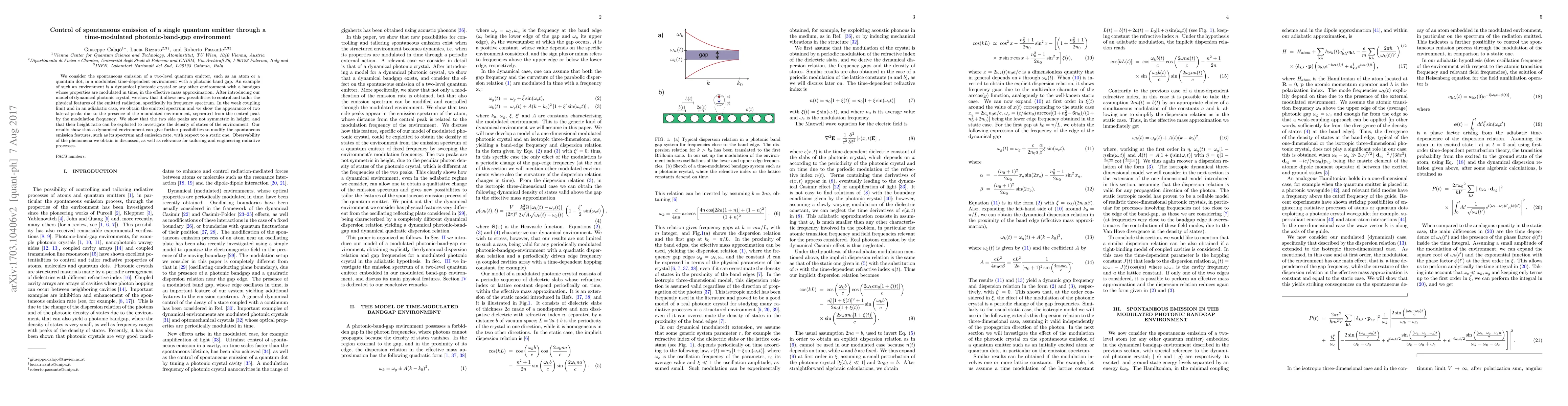 This paper explores controlling the spontaneous emission of a quantum emitter in a time-modulated photonic-band-gap environment, demonstrating the emergence of lateral peaks in the emitted spectrum due to modulation. The study highlights the potential to tailor the emission features and investigate the density of states through the modulation-induced asymmetry.