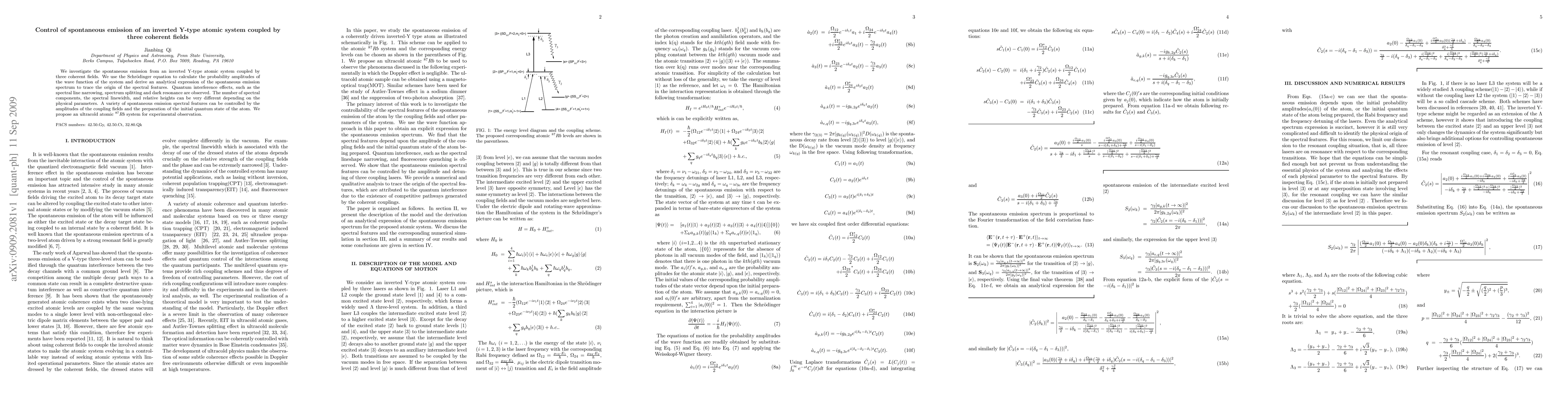 Researchers investigated spontaneous emission from an inverted Y-type atomic system coupled by three coherent fields, discovering quantum interference effects like spectral line narrowing and dark resonance that can be controlled by physical parameters.