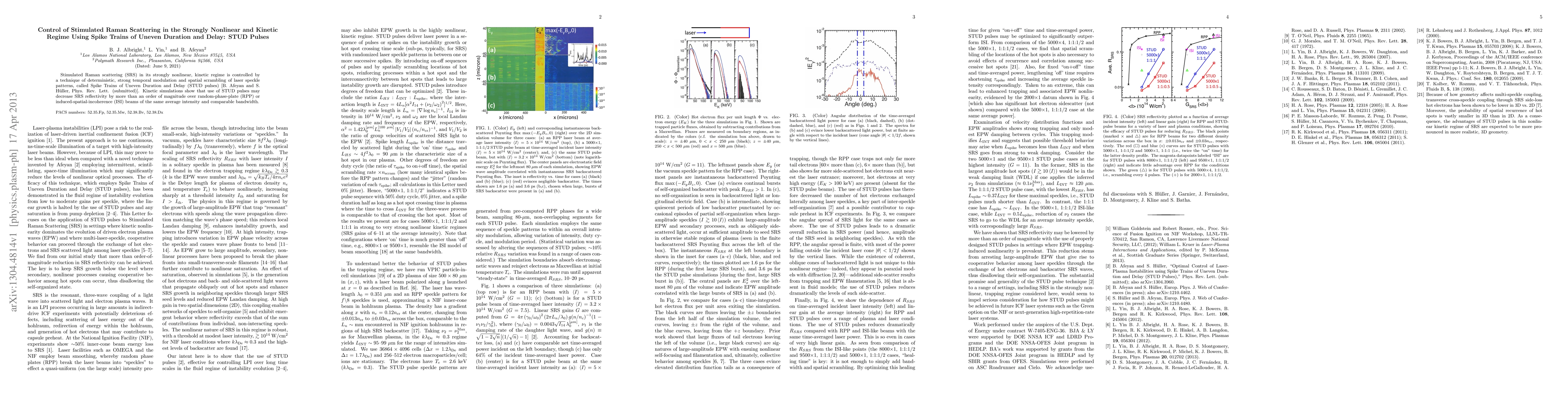 This paper proposes a novel technique called Spike Trains of Uneven Duration and Delay (STUD pulses) to control stimulated Raman scattering in its strongly nonlinear, kinetic regime. STUD pulses achieve significant reduction in SRS reflectivity compared to traditional methods like random-phase-plate or induced-spatial-incoherence beams.