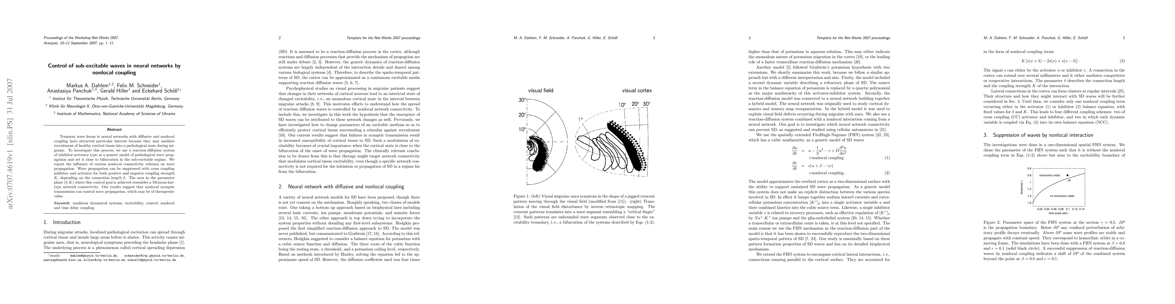 This paper investigates how nonlocal coupling in neural networks can control sub-excitable waves, potentially mitigating pathological wave propagation seen in conditions like migraine. The study finds that specific nonlocal connectivity schemes can suppress wave propagation, suggesting therapeutic potential for controlling such neural dynamics.