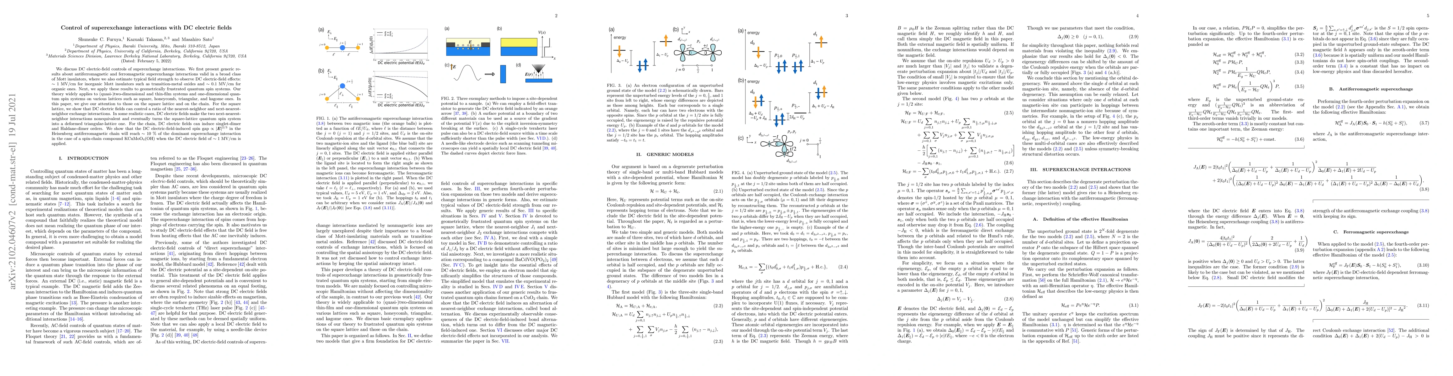 This paper explores how DC electric fields can manipulate superexchange interactions in Mott insulators, estimating typical field strengths for inorganic and organic materials. It demonstrates that such fields can control exchange interactions in geometrically frustrated quantum spin systems, inducing various orders and spin gaps in square lattice and chain systems.