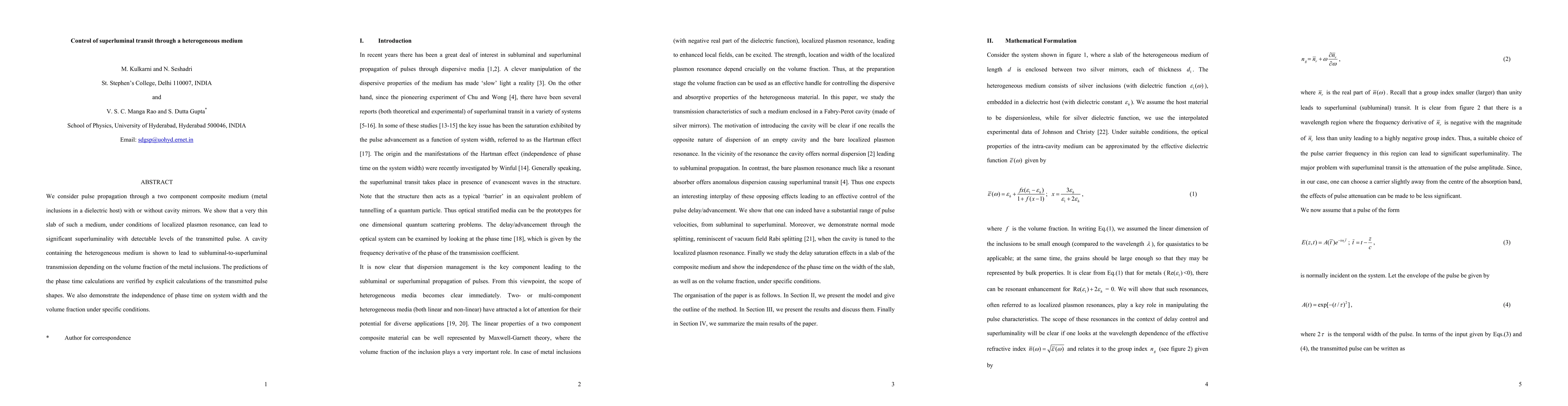 We consider pulse propagation through a two component composite medium (metal inclusions in a dielectric host) with or without cavity mirrors. We show that a very thin slab of such a medium, under conditions of localized plasmon resonance, can lead to significant superluminality with detectable levels of transmitted pulse. A cavity containing the heterogeneous medium is shown to lead to subluminal-to-superluminal transmission depending on the volume fraction of the metal inclusions. The predictions of phase time calculations are verified by explicit calculations of the transmitted pulse shapes. We also demonstrate the independence of the phase time on system width and the volume fraction under specific conditions.