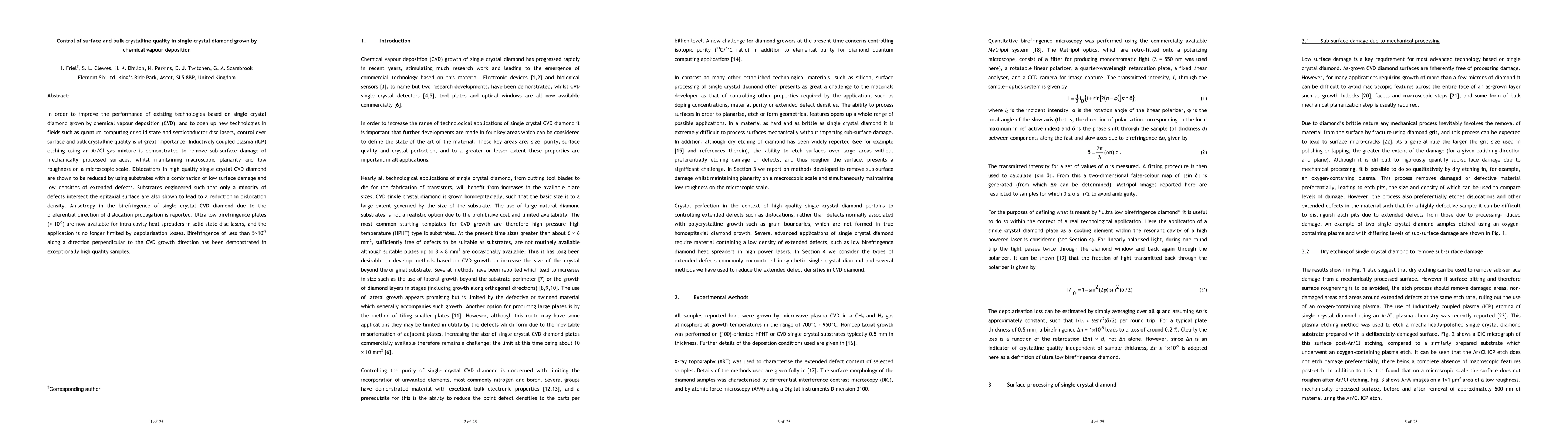 This paper investigates methods to enhance surface and bulk crystalline quality in single crystal diamond grown via chemical vapour deposition (CVD), including the use of ICP etching to remove sub-surface damage and the strategic use of substrates to reduce dislocation density, leading to ultra-low birefringence suitable for advanced laser applications.