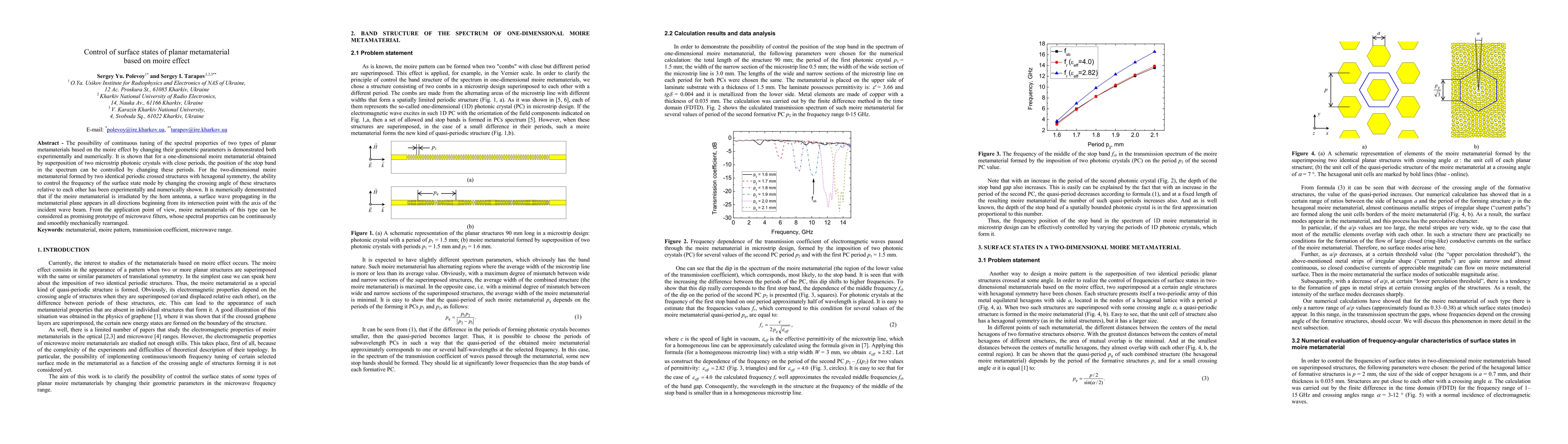This paper demonstrates the continuous tuning of spectral properties of planar metamaterials based on the moire effect by adjusting geometric parameters, showing control over stop bands and surface state modes. Potential applications include the development of reconfigurable microwave filters.