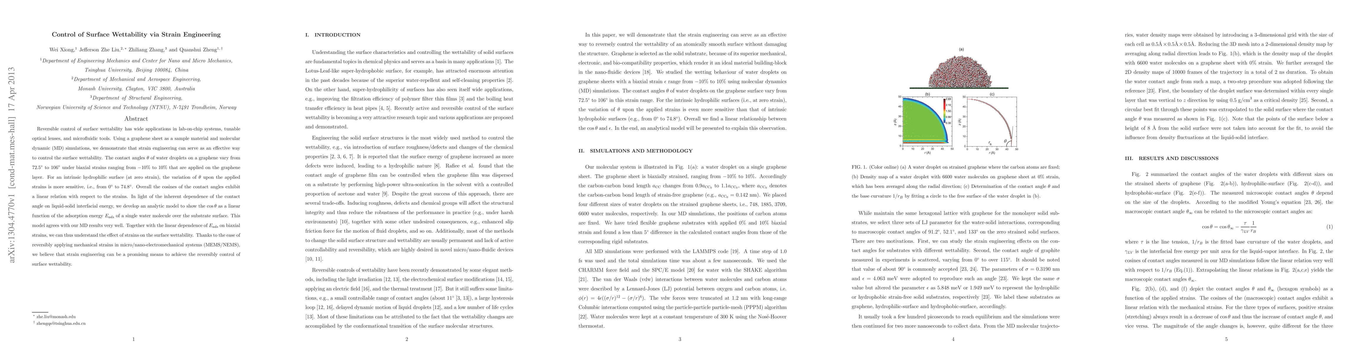 This paper demonstrates that strain engineering on graphene can reversibly control surface wettability, with contact angles varying from 72.5$^\circ$ to 106$^\circ$ under biaxial strains. An analytic model correlates the cosine of the contact angle with the adsorption energy of a water molecule, showing linear dependence on applied strain, thus providing a promising method for controlling wettability in MEMS/NEMS.