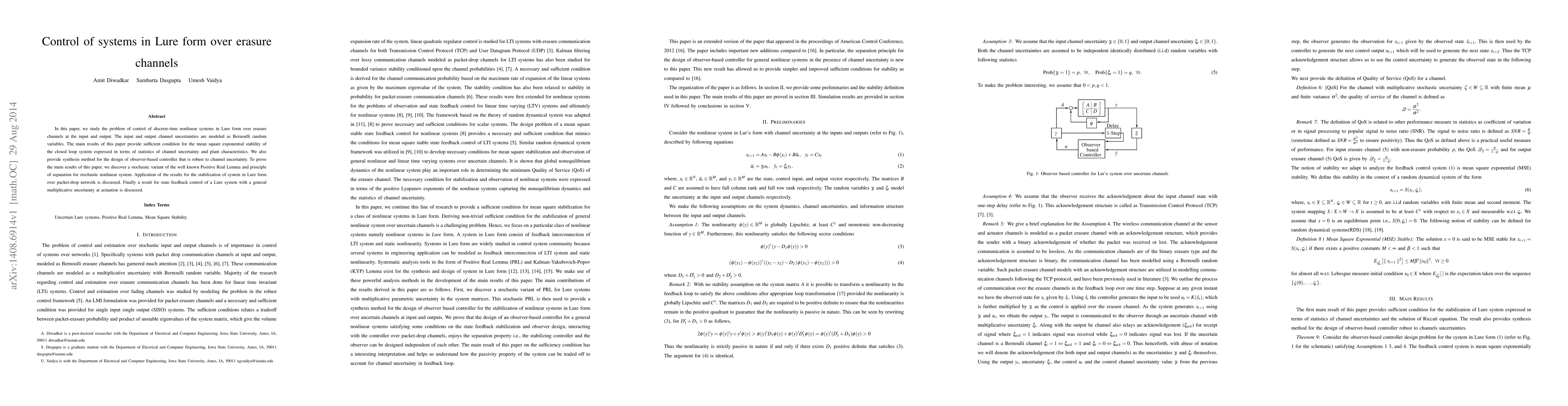 In this paper, we study the problem of control of discrete-time nonlinear systems in Lure form over erasure channels at the input and output. The input and output channel uncertainties are modeled as Bernoulli random variables. The main results of this paper provide sufficient condition for the mean square exponential stability of the closed loop system expressed in terms of statistics of channel uncertainty and plant characteristics. We also provide synthesis method for the design of observer-based controller that is robust to channel uncertainty. To prove the main results of this paper, we discover a stochastic variant of the well known Positive Real Lemma and principle of separation for stochastic nonlinear system. Application of the results for the stabilization of system in Lure form over packet-drop network is discussed. Finally a result for state feedback control of a Lure system with a general multiplicative uncertainty at actuation is discussed.