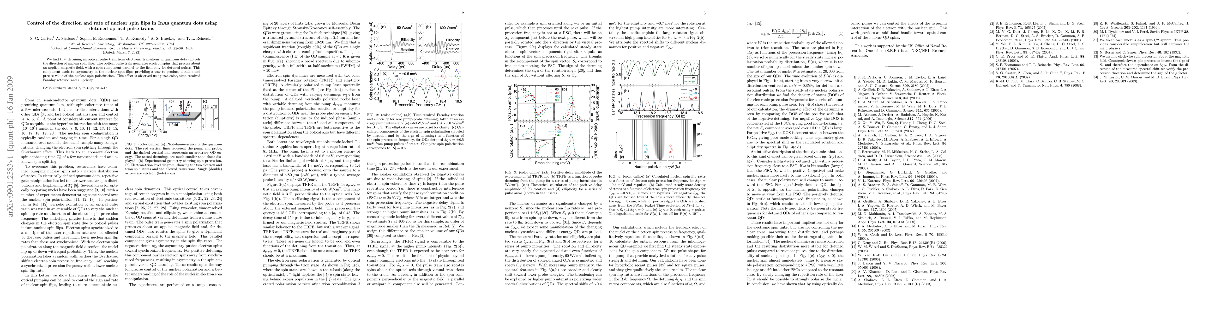 This paper demonstrates that detuning optical pulse trains from electronic transitions in InAs quantum dots can control nuclear spin flips, enabling precise nuclear spin polarization through a mechanism involving electron spin precession. The effect is confirmed using two-color, time-resolved Faraday rotation and ellipticity measurements.