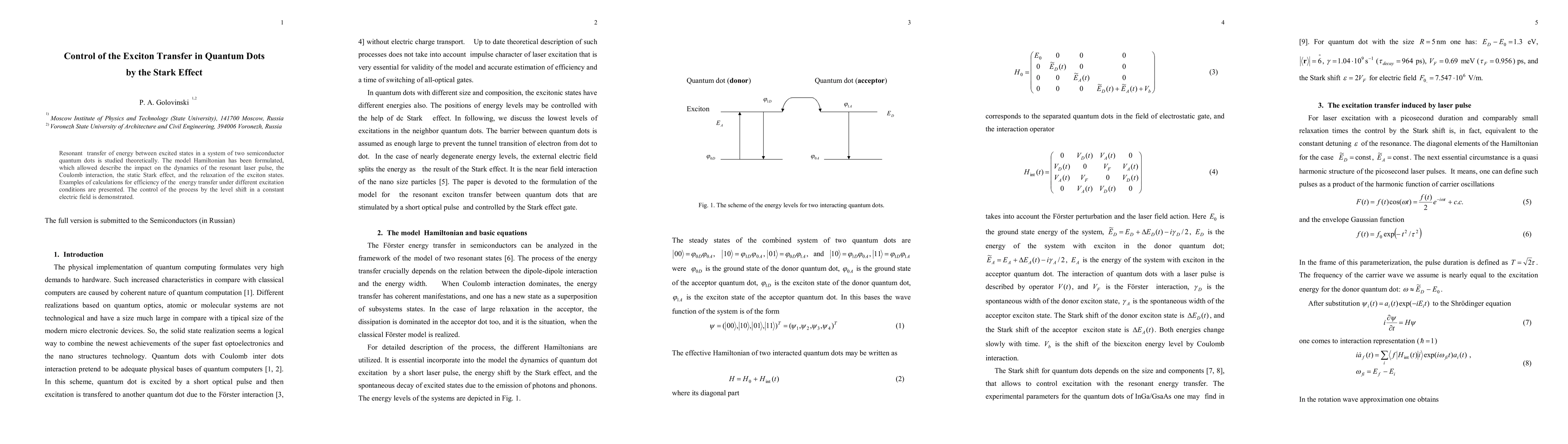 This research theoretically investigates the resonant energy transfer between excited states in semiconductor quantum dots, highlighting the role of the Stark effect in controlling exciton dynamics. The study demonstrates how a constant electric field can manipulate the efficiency of energy transfer through level shifts.