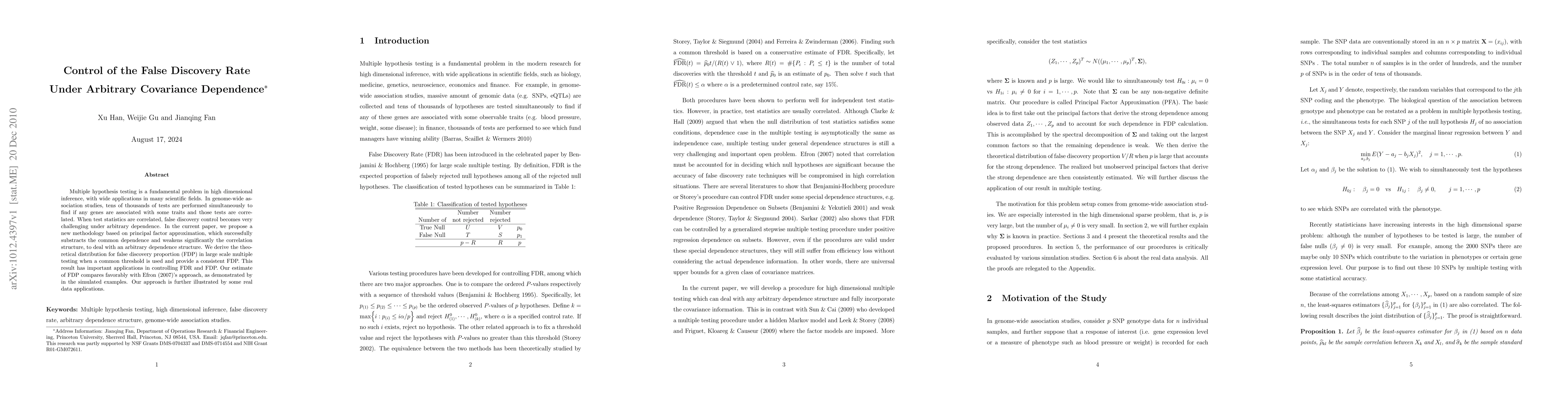 This paper proposes a novel methodology based on principal factor approximation to control the false discovery rate (FDR) under arbitrary covariance dependence in multiple hypothesis testing, especially relevant in genome-wide association studies. The method effectively reduces correlations and provides a consistent estimate of the false discovery proportion (FDP), outperforming Efron's (2007) approach in simulations and real data applications.