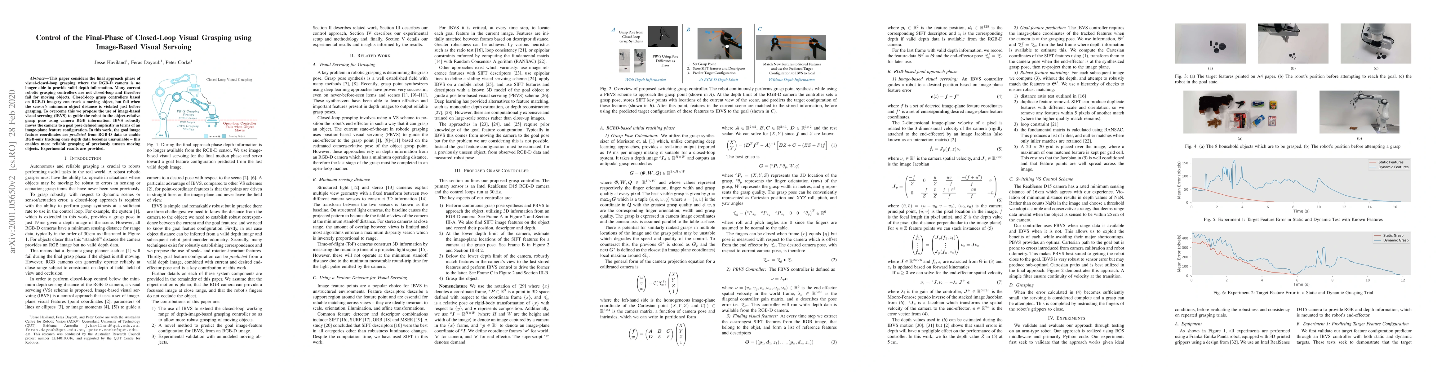 This paper proposes using image-based visual servoing (IBVS) to control the final phase of closed-loop visual grasping, enabling reliable tracking and grasping of moving objects when depth information from RGB-D cameras becomes unavailable. Experimental results demonstrate the effectiveness of the proposed method.