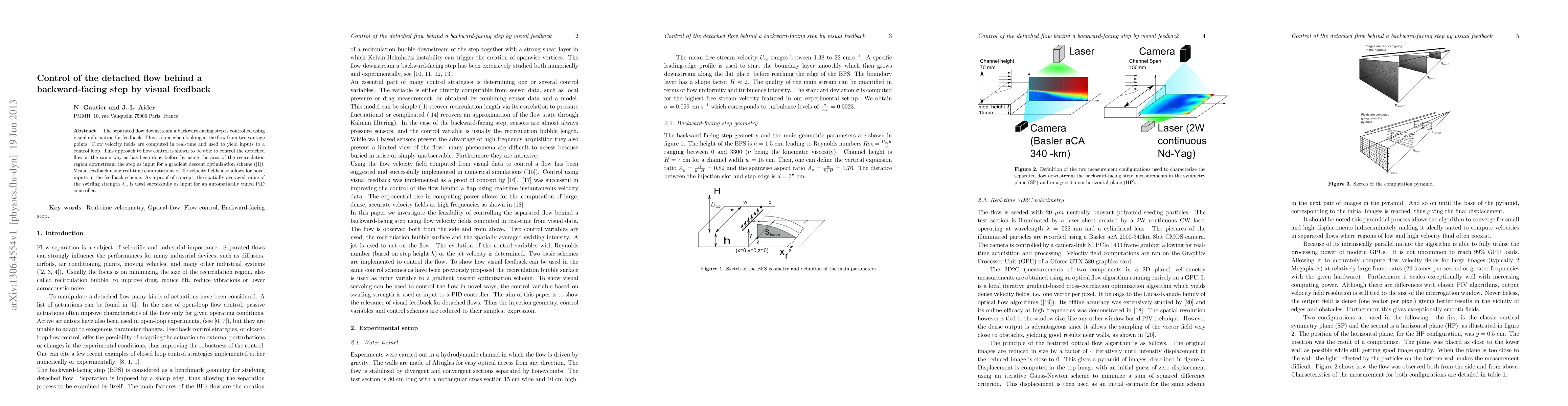 This paper explores controlling flow behind a backward-facing step using visual feedback from two vantage points, with real-time computation of 2D velocity fields. The approach successfully manages detached flow, demonstrating the use of swirling strength as an input for an automatically tuned PID controller.