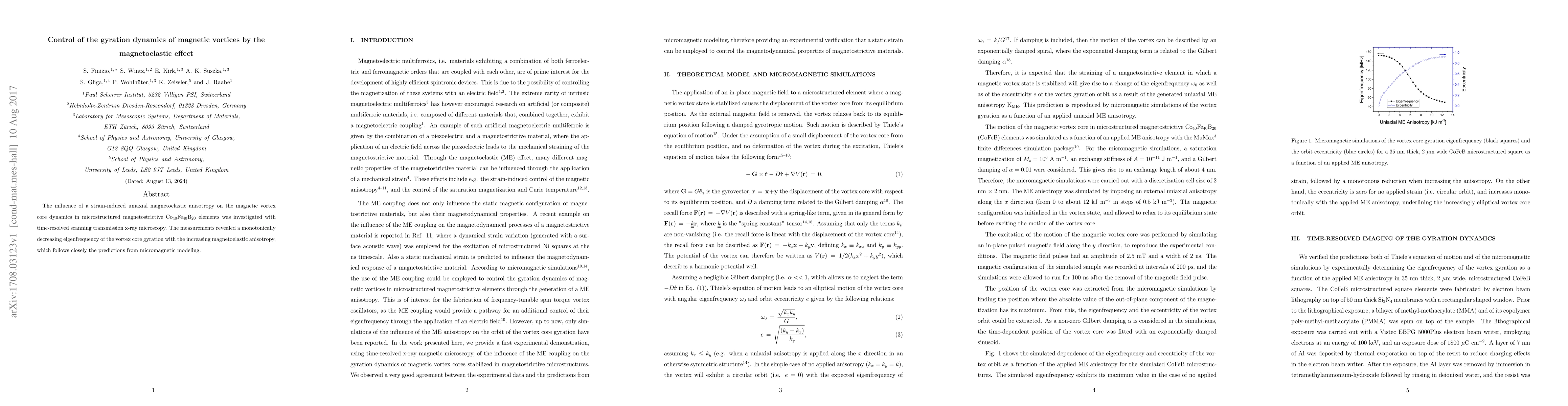 This study investigates how strain-induced magnetoelastic anisotropy affects the gyration dynamics of magnetic vortices in Co$_{40}$Fe$_{40}$B$_{20}$ microstructures, revealing a decreasing eigenfrequency with increased anisotropy, aligning with micromagnetic modeling predictions.
