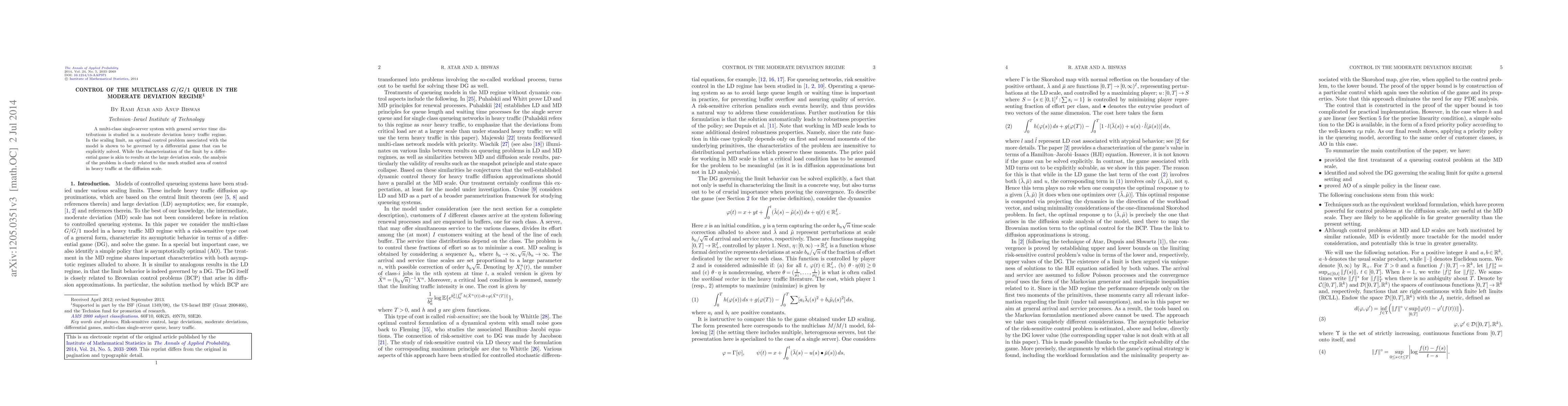 This paper studies a multi-class $G/G/1$ queue under heavy traffic conditions, focusing on the moderate deviation regime. It reveals that the optimal control problem is governed by a solvable differential game, linking its analysis to control theory in heavy traffic at the diffusion scale.