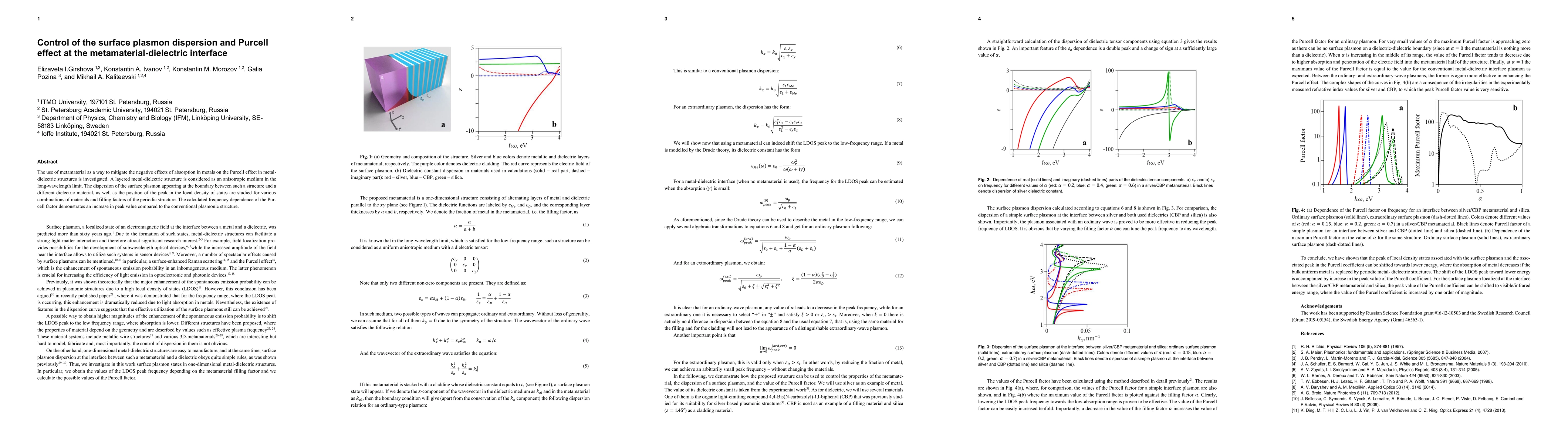 This paper explores the use of metamaterial to control surface plasmon dispersion and enhance the Purcell effect at the metamaterial-dielectric interface, showing an increased peak in the local density of states and improved Purcell factor compared to conventional structures.