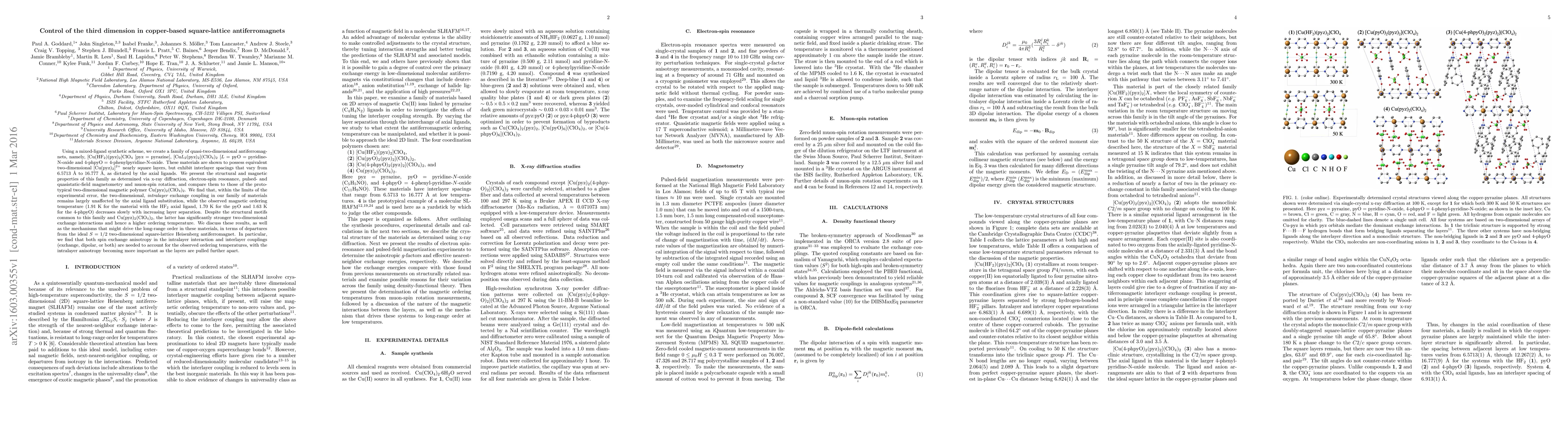 Using a mixed-ligand synthetic scheme, we create a family of quasi-two-dimensional antiferromagnets, namely, [Cu(HF$_2$)(pyz)$_2$]ClO$_4$ [pyz = pyrazine], [Cu$L_2$(pyz)$_2$](ClO$_4$)$_2$ [$L$ = pyO = pyridine-N-oxide and 4-phpyO = 4-phenylpyridine-N-oxide. These materials are shown to possess equivalent two-dimensional [Cu(pyz)$_2$]$^{2+}$ nearly square layers, but exhibit interlayer spacings that vary from 6.5713~\AA ~to 16.777~\AA, as dictated by the axial ligands. We present the structural and magnetic properties of this family as determined via x-ray diffraction, electron-spin resonance, pulsed- and quasistatic-field magnetometry and muon-spin rotation, and compare them to those of the prototypical two-dimensional magnetic polymer Cu(pyz)$_2$(ClO$_4$)$_2$. We find that, within the limits of the experimental error, the two-dimensional, {\it intralayer} exchange coupling in our family of materials remains largely unaffected by the axial ligand substitution, while the observed magnetic ordering temperature decreases slowly with increasing layer separation. Despite the structural motifs common to this family and Cu(pyz)$_2$(ClO$_4$)$_2$, the latter has significantly stronger two-dimensional exchange interactions and hence a higher ordering temperature. We discuss these results, as well as the mechanisms that might drive the long-range order in these materials, in terms of departures from the ideal $S=1/2$ two-dimensional square-lattice Heisenberg antiferromagnet. In particular, we find that both spin exchange anisotropy in the intralayer interaction and interlayer couplings (exchange, dipolar, or both) are needed to account for the observed ordering temperatures, with the intralayer anisotropy becoming more important as the layers are pulled further apart.