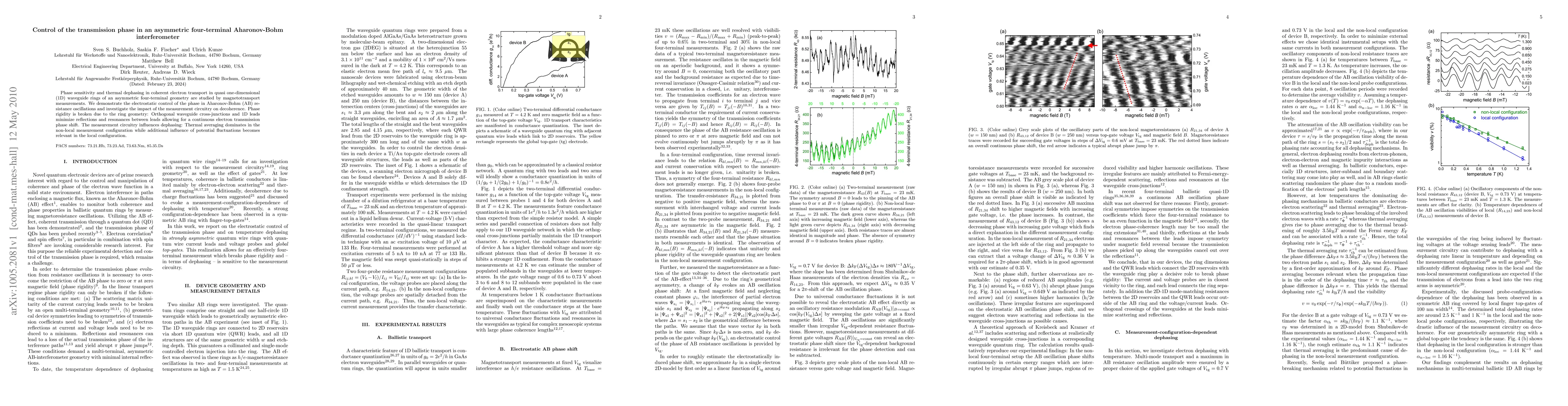 Phase sensitivity and thermal dephasing in coherent electron transport in quasi one-dimensional (1D) waveguide rings of an asymmetric four-terminal geometry are studied by magnetotransport measurements. We demonstrate the electrostatic control of the phase in Aharonov-Bohm (AB) resistance oscillations and investigate the impact of the measurement circuitry on decoherence. Phase rigidity is broken due to the ring geometry: Orthogonal waveguide cross-junctions and 1D leads minimize reflections and resonances between leads allowing for a continuous electron transmission phase shift. The measurement circuitry influences dephasing: Thermal averaging dominates in the non-local measurement configuration while additional influence of potential fluctuations becomes relevant in the local configuration.