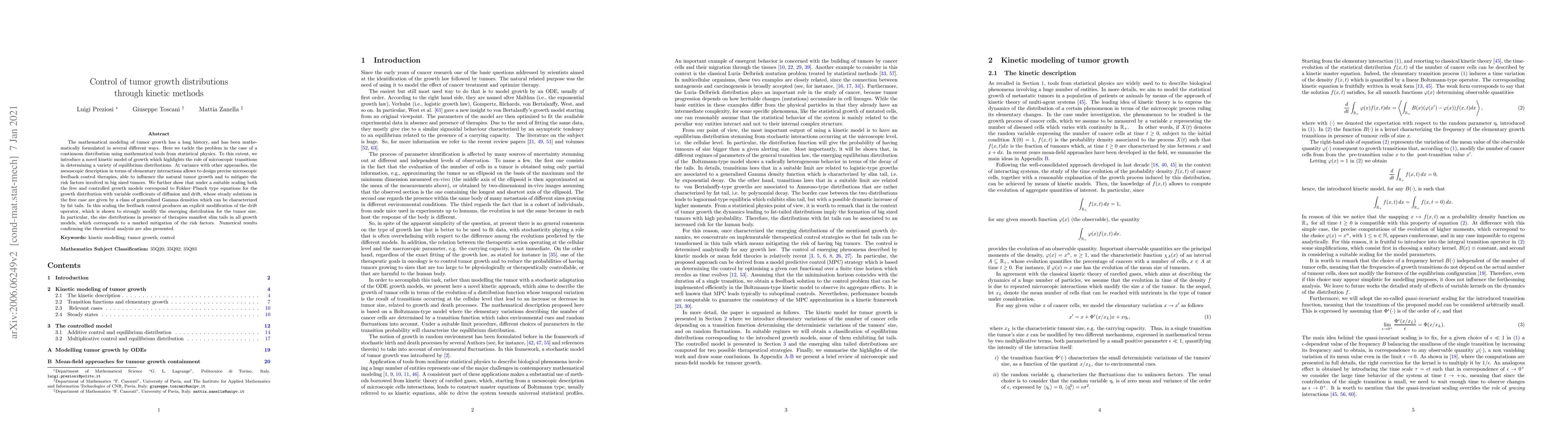 This research introduces a novel kinetic model for tumor growth distribution, highlighting microscopic transitions' role. It proposes feedback control therapies, demonstrating their effectiveness in mitigating risk factors associated with large tumors through modifications in drift operators, resulting in slimmer tumor size distributions.