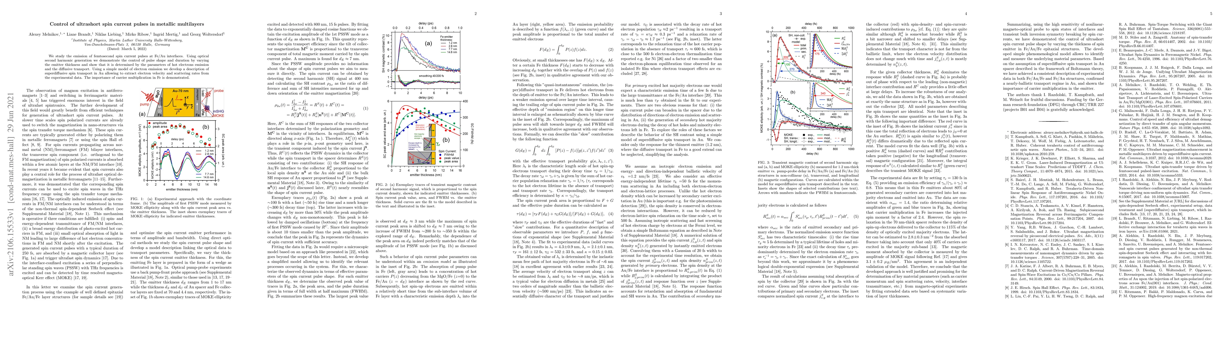 We study the emission of femtosecond spin current pulses at Fe/Au interfaces. Using optical second harmonic generation we demonstrate the control of pulse shape and duration by varying the emitter thickness and show that it is determined by the parameters of hot electrons emission and the diffusive transport. Using a simple model of electron emission we develop a description of superdiffusive spin transport in Au allowing to extract electron velocity and scattering rates from the experimental data. The importance of carrier multiplication in Fe is demonstrated.