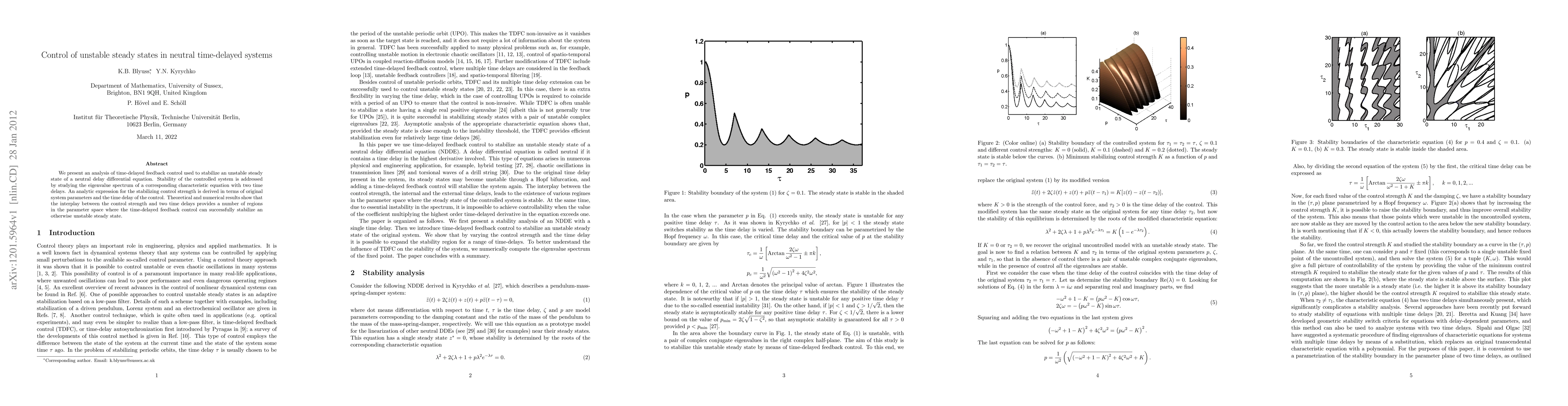 This paper analyzes time-delayed feedback control to stabilize an unstable steady state in neutral delay differential equations. An analytic expression for the control strength is derived, revealing multiple regions in parameter space where the control can effectively stabilize the system.