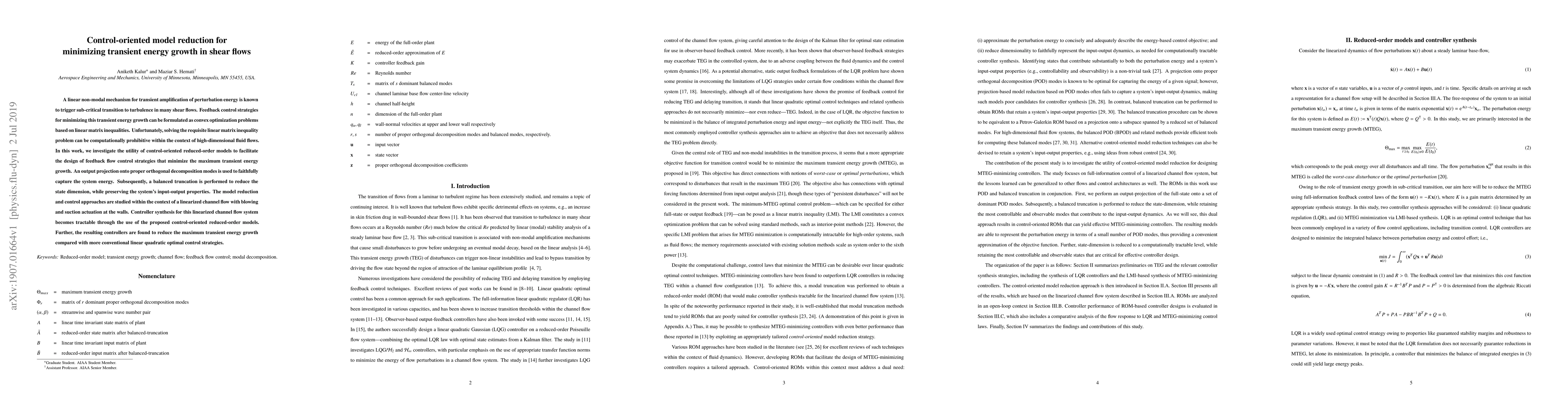 This paper proposes a control-oriented model reduction technique to design feedback control strategies minimizing transient energy growth in shear flows, using reduced-order models based on proper orthogonal decomposition and balanced truncation. The approach enables tractable controller synthesis for a linearized channel flow system, resulting in effective reduction of transient energy growth compared to conventional methods.