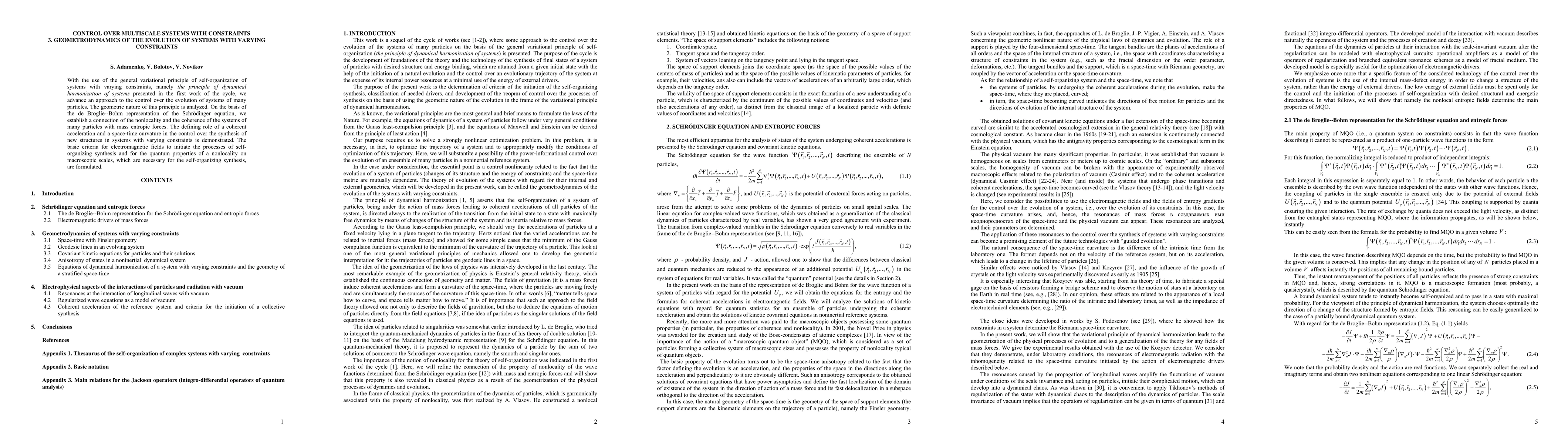 With the use of the general variational principle of self-organization of systems with varying constraints, namely the principle of dynamical harmonization of systems presented in the first work of the cycle, we advance an approach to the control over the evolution of systems of many particles. The geometric nature of this principle is analyzed. On the basis of the de Broglie--Bohm representation of the Schr\"odinger equation, we establish a connection of the nonlocality and the coherence of the systems of many particles with mass entropic forces. The defining role of a coherent acceleration and a space-time curvature in the control over the synthesis of new structures in systems with varying constraints is demonstrated. The basic criteria for electromagnetic fields to initiate the processes of self-organizing synthesis and for the quantum properties of a nonlocality on macroscopic scales, which are necessary for the self-organizing synthesis, are formulated.